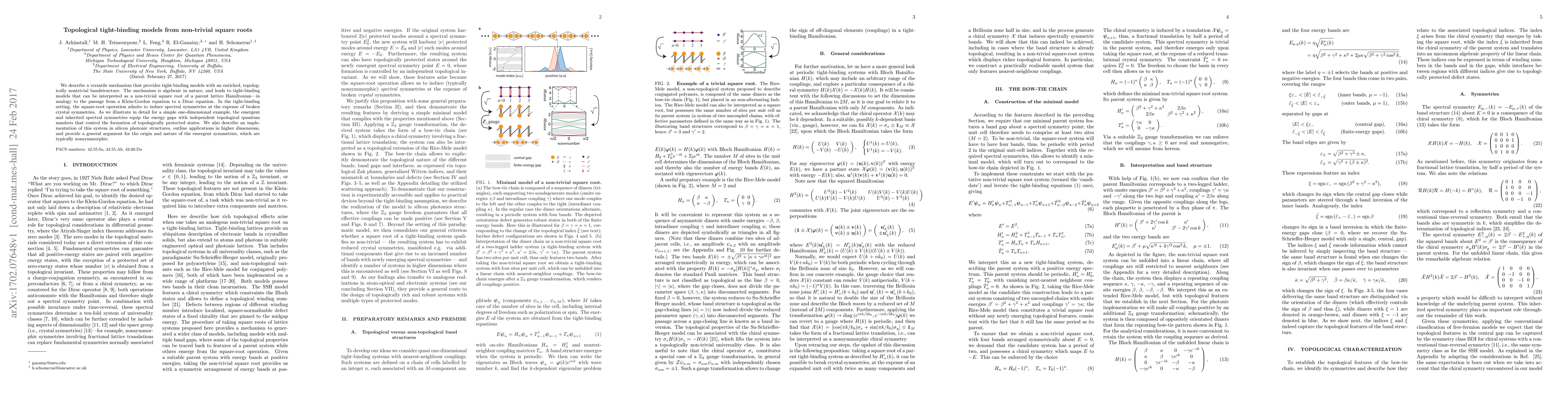 We describe a versatile mechanism that provides tight-binding models with an enriched, topologically nontrivial bandstructure. The mechanism is algebraic in nature, and leads to tight-binding models that can be interpreted as a non-trivial square root of a parent lattice Hamiltonian---in analogy to the passage from a Klein-Gordon equation to a Dirac equation. In the tight-binding setting, the square-root operation admits to induce spectral symmetries at the expense of broken crystal symmetries. As we illustrate in detail for a simple one-dimensional example, the emergent and inherited spectral symmetries equip the energy gaps with independent topological quantum numbers that control the formation of topologically protected states. We also describe an implementation of this system in silicon photonic structures, outline applications in higher dimensions, and provide a general argument for the origin and nature of the emergent symmetries, which are typically nonsymmorphic.