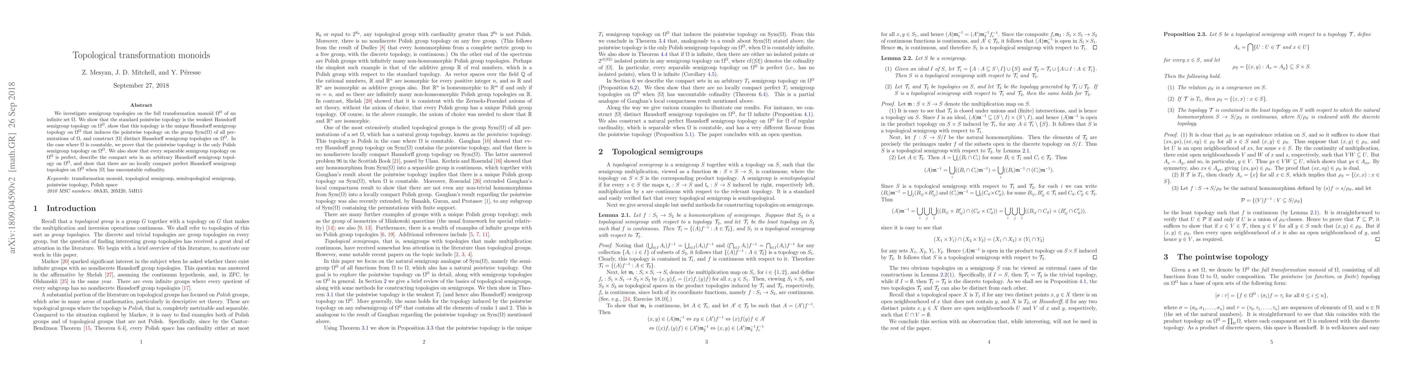 This paper explores semigroup topologies on the transformation monoid T(X) of an infinite set X, showing various properties and implications for different topological structures.