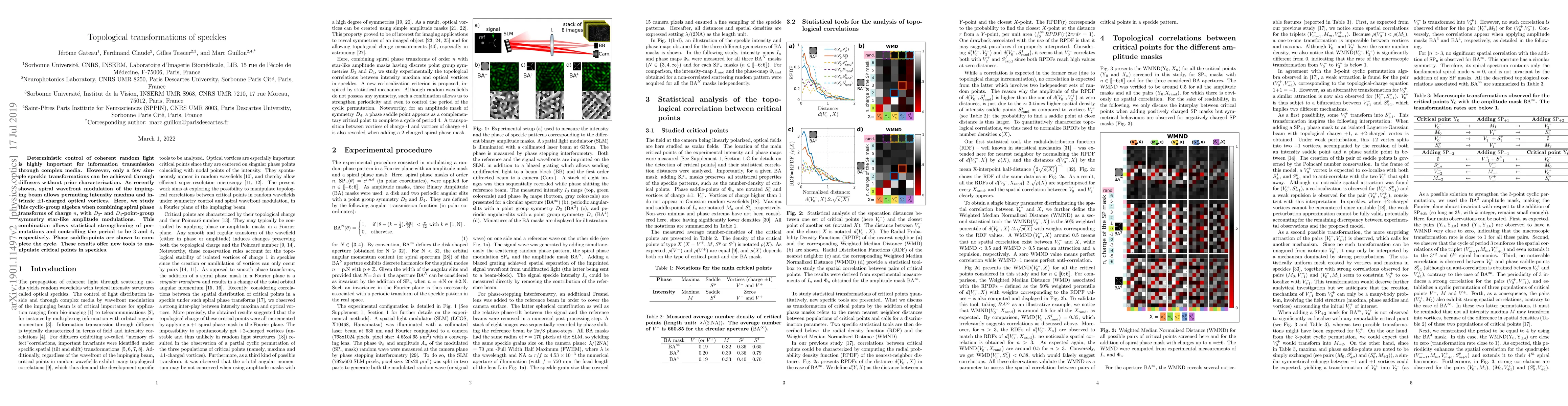 Deterministic control of coherent random light is highly important for information transmission through complex media. However, only a few simple speckle transformations can be achieved through diffusers without prior characterization. As recently shown, spiral wavefront modulation of the impinging beam allows permuting intensity maxima and intrinsic $\pm 1$-charged optical vortices. Here, we study this cyclic-group algebra when combining spiral phase transforms of charge $n$, with $D_3$- and $D_4$-point-group symmetry star-like amplitude modulations. This combination allows statistical strengthening of permutations and controlling the period to be 3 and 4, respectively. Phase saddle-points are shown to complete the cycle. These results offer new tools to manipulate critical points in speckles.