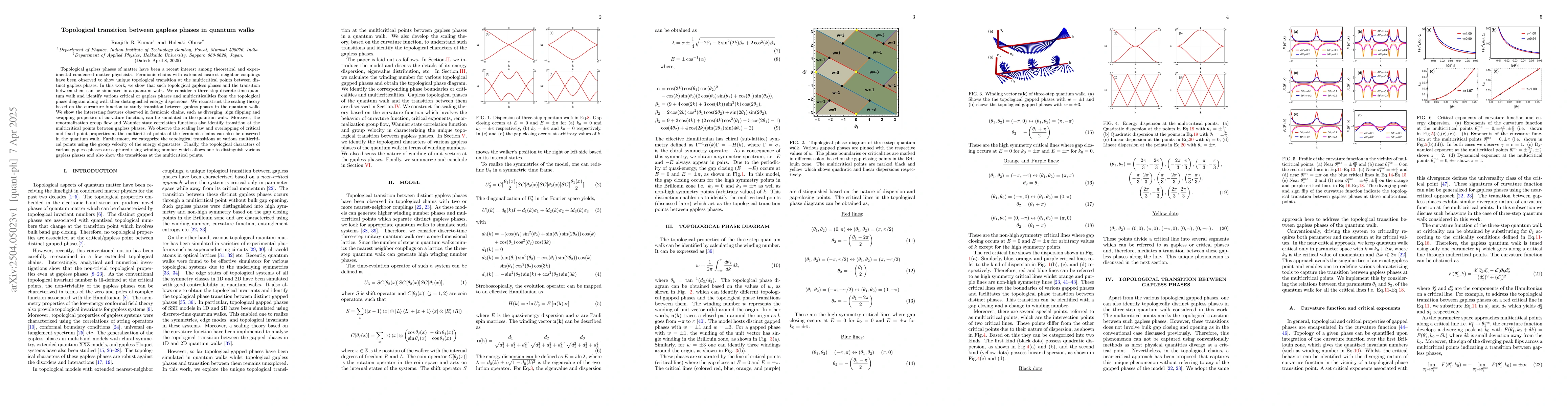 The research utilizes a three-step discrete-time quantum walk to simulate topological gapless phases and transitions between them, reconstructing a scaling theory based on the curvature function and employing renormalization group flow and Wannier state correlation functions for analysis.