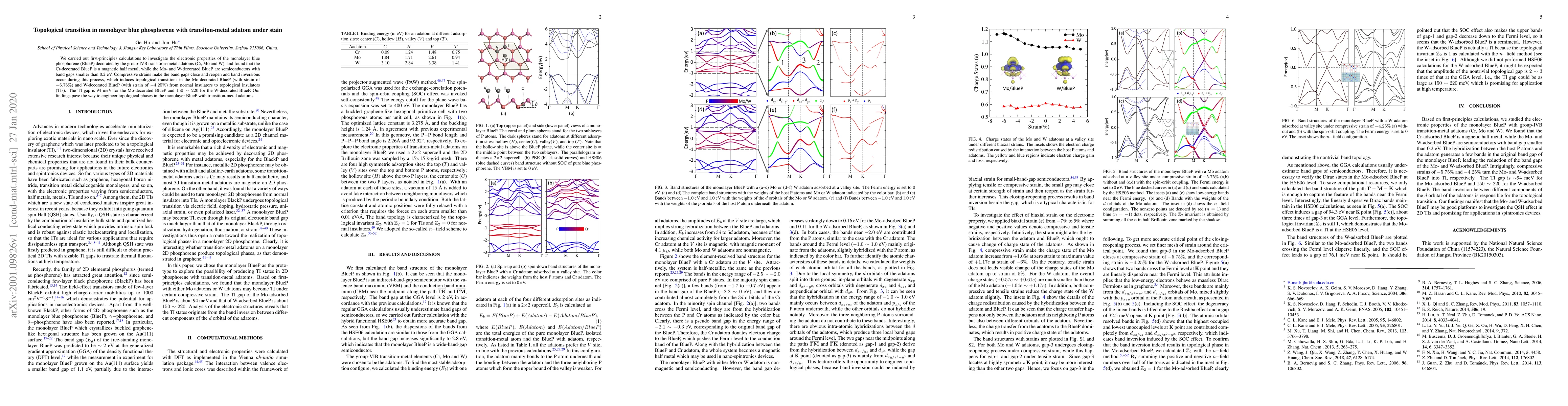 First-principles calculations reveal that monolayer blue phosphorene (BlueP) decorated with Cr, Mo, and W transition-metal adatoms exhibits distinct electronic properties, with Cr forming a magnetic half metal and Mo and W creating semiconductors. Strain-induced topological transitions convert Mo- and W-decorated BlueP into topological insulators with gaps of 94 meV and 150~220 meV, respectively.