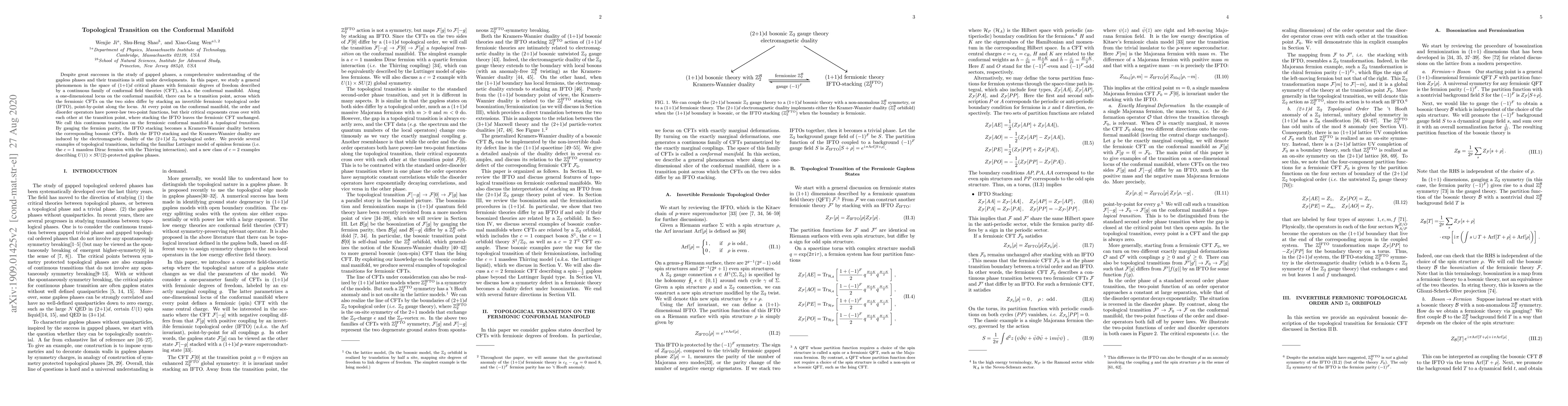Despite great successes in the study of gapped phases, a comprehensive understanding of the gapless phases and their transitions is still under developments. In this paper, we study a general phenomenon in the space of (1+1)$d$ critical phases with fermionic degrees of freedom described by a continuous family of conformal field theories (CFT), a.k.a. the conformal manifold. Along a one-dimensional locus on the conformal manifold, there can be a transition point, across which the fermionic CFTs on the two sides differ by stacking an invertible fermionic topological order (IFTO), point-by-point along the locus. At every point on the conformal manifold, the order and disorder operators have power-law two-point functions, but their critical exponents cross over with each other at the transition point, where stacking the IFTO leaves the fermionic CFT unchanged. We call this continuous transition on the fermionic conformal manifold a topological transition. By gauging the fermion parity, the IFTO stacking becomes a Kramers-Wannier duality between the corresponding bosonic CFTs. Both the IFTO stacking and the Kramers-Wannier duality are induced by the electromagnetic duality of the (2+1)$d$ $\mathbb{Z}_2$ topological order. We provide several examples of topological transitions, including the familiar Luttinger model of spinless fermions (i.e. the $c=1$ massless Dirac fermion with the Thirring interaction), and a new class of $c=2$ examples describing $U(1)\times SU(2)$-protected gapless phases.