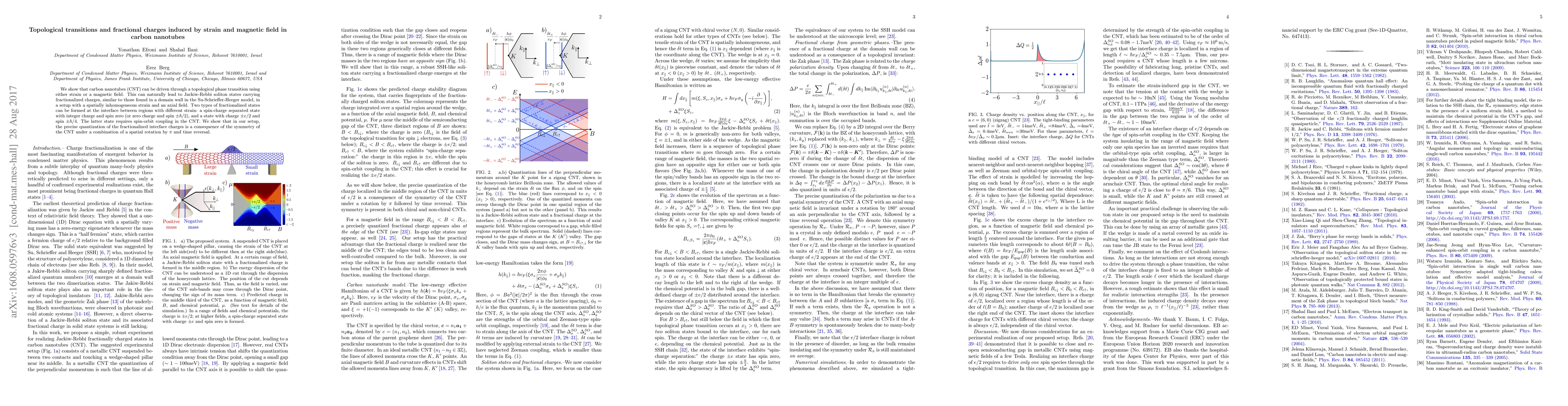 We show that carbon nanotubes (CNT) can be driven through a topological phase transition using either strain or a magnetic field. This can naturally lead to Jackiw-Rebbi soliton states carrying fractionalized charges, similar to those found in a domain wall in the Su-Schrieffer-Heeger model, in a setup with a spatially inhomogeneous strain and an axial field. Two types of fractionalized states can be formed at the interface between regions with different strain: a spin-charge separated state with integer charge and spin zero (or zero charge and spin $\pm \hbar/2$), and a state with charge $\pm e/2$ and spin $\pm \hbar/4$. The latter state requires spin-orbit coupling in the CNT. We show that in our setup, the precise quantization of the fractionalized interface charges is a consequence of the symmetry of the CNT under a combination of a spatial rotation by $\pi$ and time reversal. Finally, we comment on the effects of many-body interaction on this phenomena.
