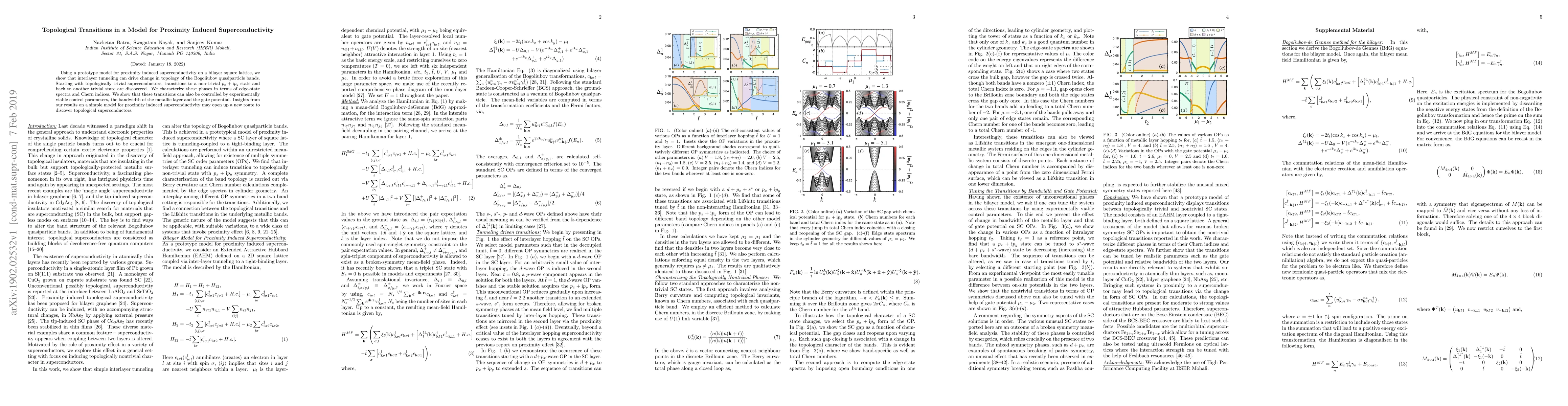 Using a prototype model for proximity induced superconductivity on a bilayer square lattice, we show that interlayer tunneling can drive change in topology of the Bogoliubov quasiparticle bands. Starting with topologically trivial superconductors, transitions to a non-trivial $p_x + {\rm i} p_y$ state and back to another trivial state are discovered. We characterize these phases in terms of edge-state spectra and Chern indices. We show that these transitions can also be controlled by experimentally viable control parameters, the bandwidth of the metallic layer and the gate potential. Insights from our results on a simple model for proximity induced superconductivity may open up a new route to discover topological superconductors.