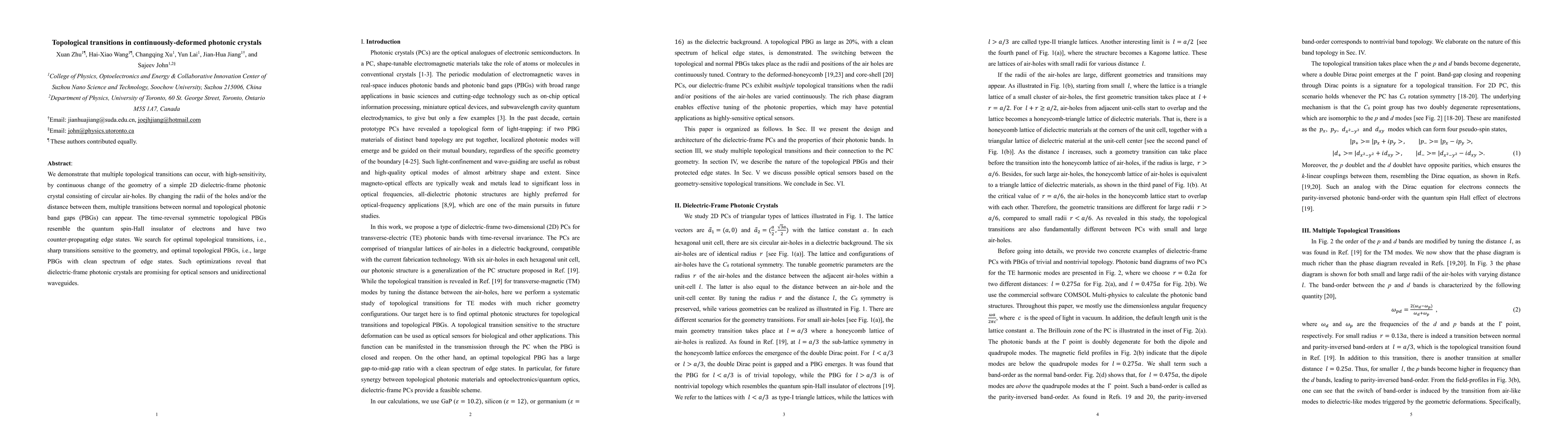 This paper investigates topological transitions in 2D photonic crystals by continuously altering their geometry, demonstrating high-sensitivity transitions between normal and topological photonic band gaps. The optimized geometry reveals potential applications in optical sensors and unidirectional waveguides.