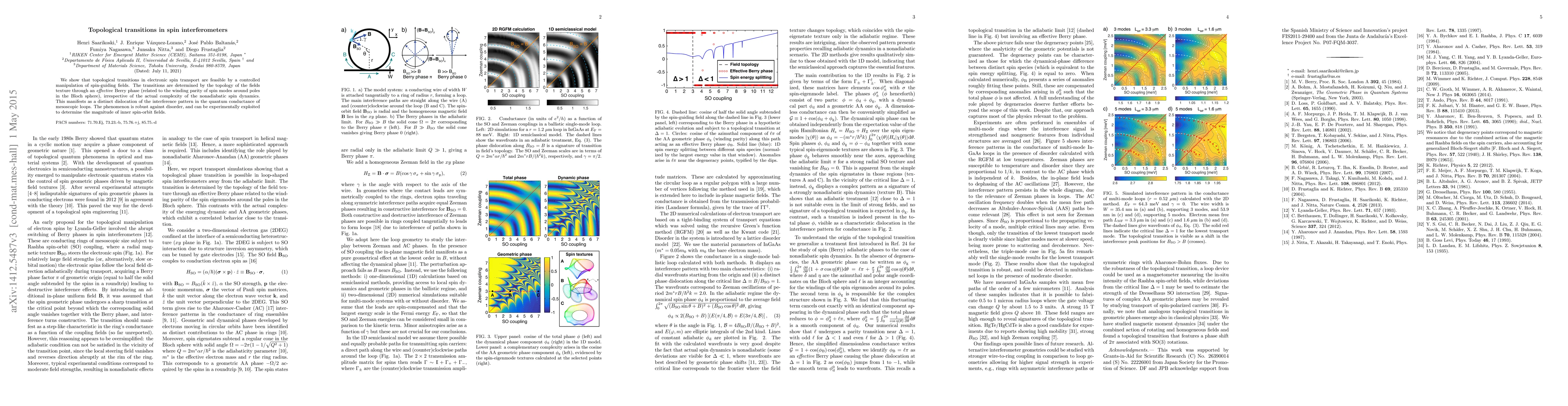 We show that topological transitions in electronic spin transport are feasible by a controlled manipulation of spin-guiding fields. The transitions are determined by the topology of the fields texture through an effective Berry phase (related to the winding parity of spin modes around poles in the Bloch sphere), irrespective of the actual complexity of the nonadiabatic spin dynamics. This manifests as a distinct dislocation of the interference pattern in the quantum conductance of mesoscopic loops. The phenomenon is robust against disorder, and can be experimentally exploited to determine the magnitude of inner spin-orbit fields.