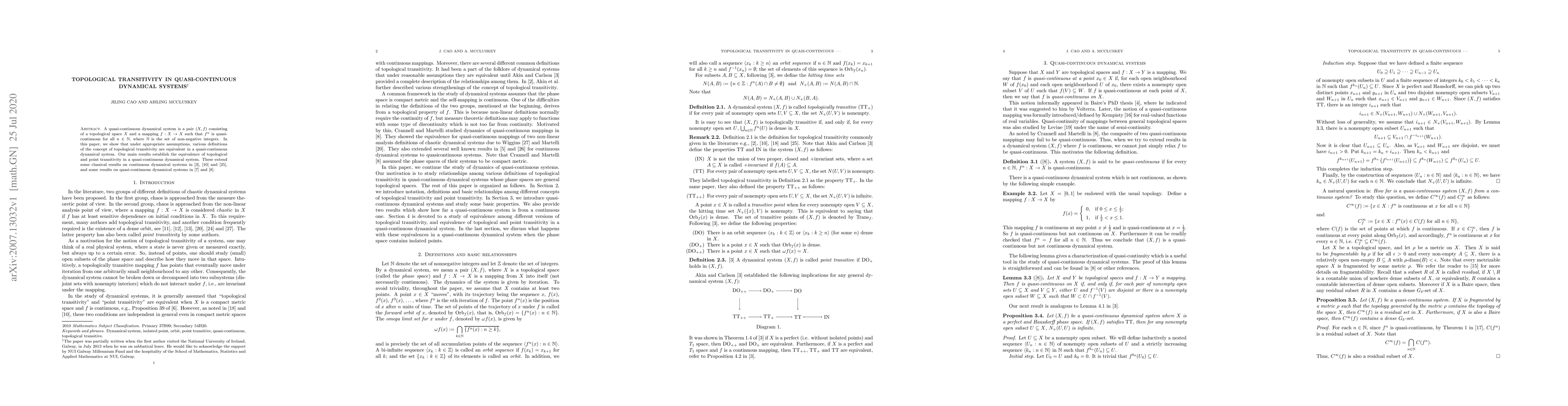 This paper explores quasi-continuous dynamical systems, proving that various definitions of topological transitivity are equivalent under certain conditions. It establishes the equivalence of topological and point transitivity in these systems, extending classical results from continuous systems and prior findings in quasi-continuous systems.