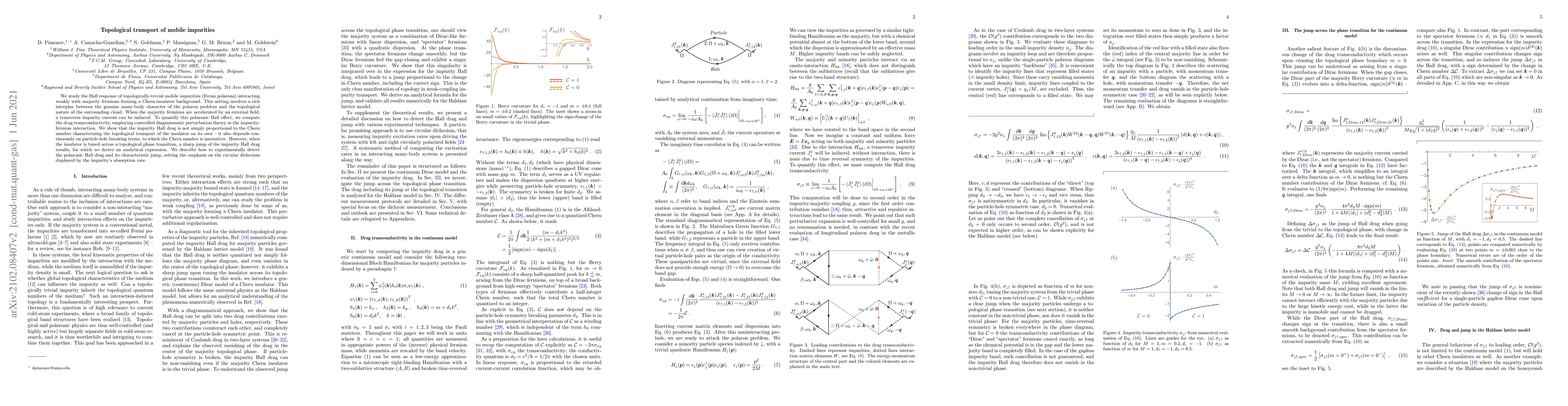 We study the Hall response of topologically-trivial mobile impurities (Fermi polarons) interacting weakly with majority fermions forming a Chern-insulator background. This setting involves a rich interplay between the genuine many-body character of the polaron problem and the topological nature of the surrounding cloud. When the majority fermions are accelerated by an external field, a transverse impurity current can be induced. To quantify this polaronic Hall effect, we compute the drag transconductivity, employing controlled diagrammatic perturbation theory in the impurity-fermion interaction. We show that the impurity Hall drag is not simply proportional to the Chern number characterizing the topological transport of the insulator on its own - it also depends continuously on particle-hole breaking terms, to which the Chern number is insensitive. However, when the insulator is tuned across a topological phase transition, a sharp jump of the impurity Hall drag results, for which we derive an analytical expression. We describe how the Hall drag and jump can be extracted from a circular dichroic measurement of impurity excitation rates, particularly suited for ultracold gas experiments.