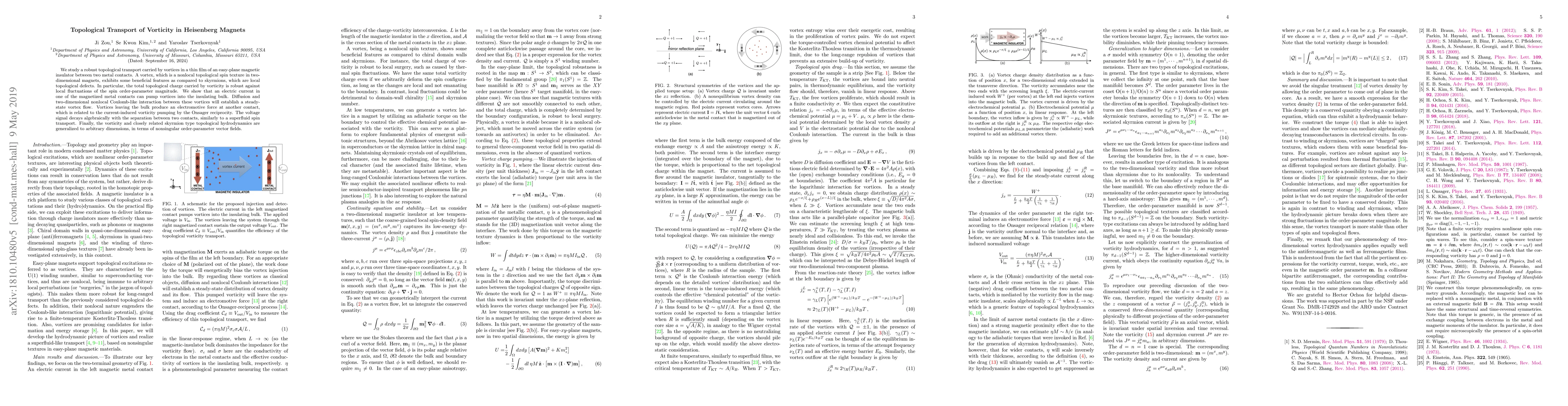 We study a robust topological transport carried by vortices in a thin film of an easy-plane ferromagnetic insulator between two metal contacts. A vortex, which is a nonlocal topological spin texture in two-dimensional magnets, exhibits some beneficial features as compared to skyrmions, which are local topological defects. In particular, the total topological charge carried by vorticity is robust against local fluctuations of the spin order-parameter magnitude. We show that an electric current in one of the magnetized metal contacts can pump vortices into the insulating bulk. Diffusion and nonlocal Coulomb-like interaction between these vortices will establish a steady-state vortex flow. Vortices leaving the bulk produce an electromotive force at another contact, which is related to the current-induced vorticity pumping by the Onsager reciprocity. The voltage signal decays algebraically with the separation between two contacts, similarly to a superfluid spin transport. Finally, the vorticity and closely related skyrmion type topological hydrodynamics are generalized to arbitrary dimensions, in terms of nonsingular order-parameter vector fields.