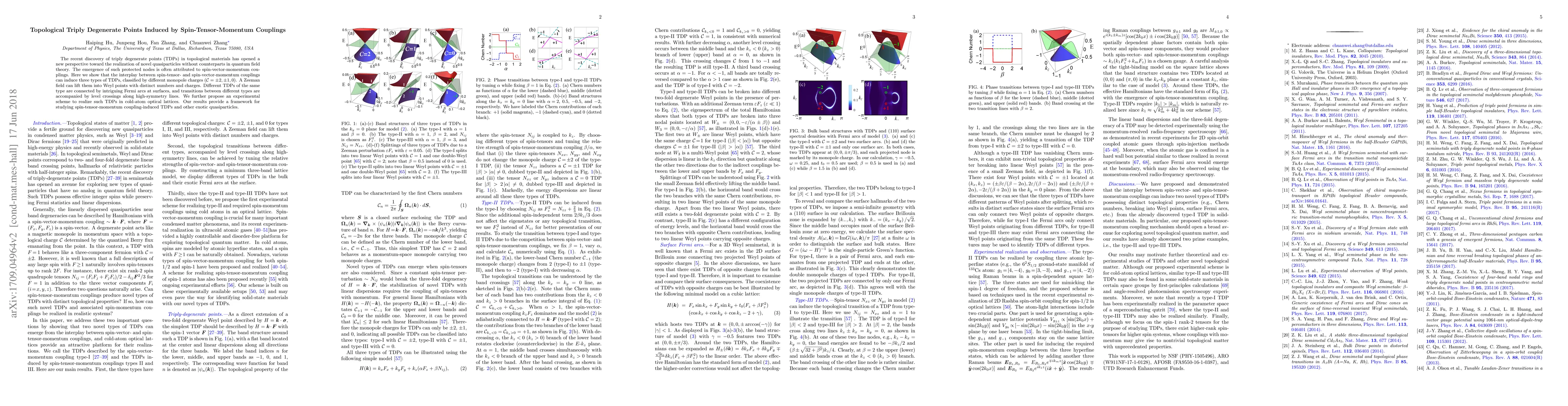 This research paper identifies three types of topologically triply degenerate points (TDPs) induced by spin-tensor- and spin-vector-momentum couplings in materials, classified by monopole charges. The study also proposes a method to realize these TDPs in cold-atom optical lattices, offering a framework for exploring novel quasiparticles.