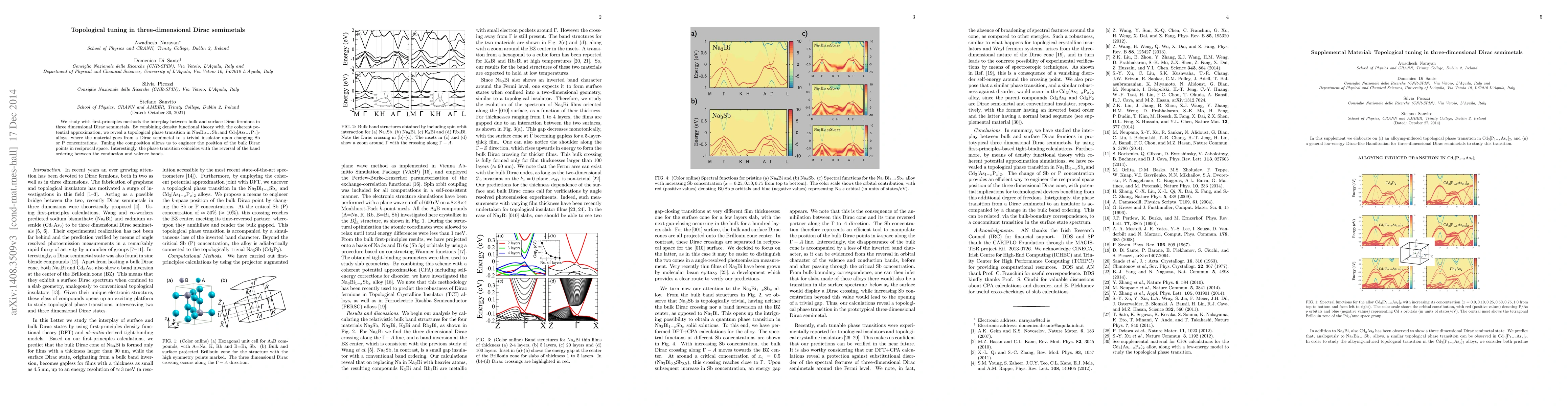 We study with first-principles methods the interplay between bulk and surface Dirac fermions in three dimensional Dirac semimetals. By combining density functional theory with the coherent potential approximation, we reveal a topological phase transition in Na$_3$Bi$_{1-x}$Sb$_{x}$ and Cd$_3$[As$_{1-x}$P$_x$]$_2$ alloys, where the material goes from a Dirac semimetal to a trivial insulator upon changing Sb or P concentrations. Tuning the composition allows us to engineer the position of the bulk Dirac points in reciprocal space. Interestingly, the phase transition coincides with the reversal of the band ordering between the conduction and valence bands.