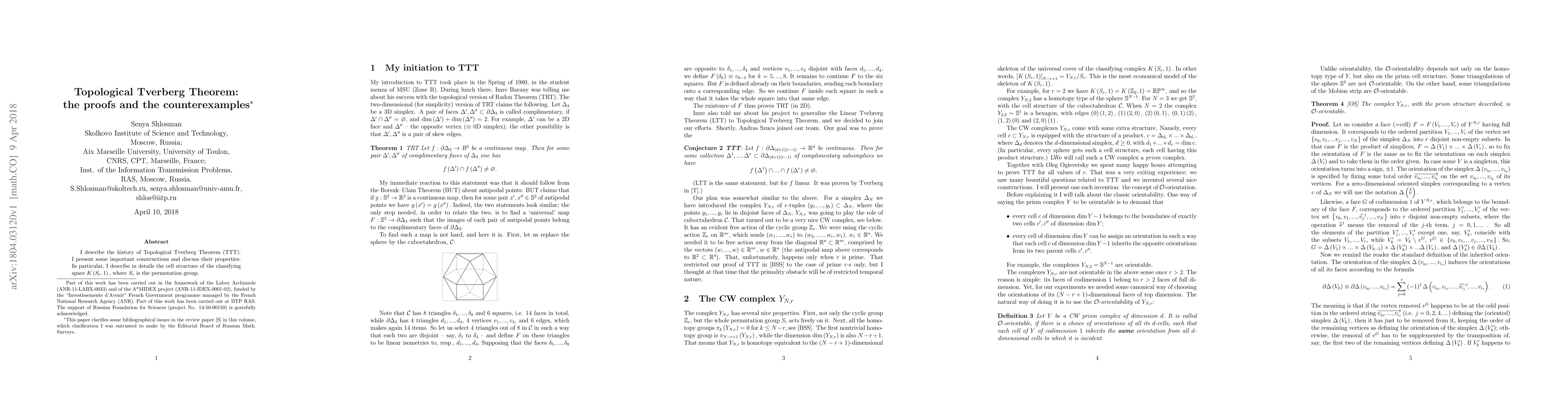 I describe the history of Topological Tverberg Theorem. I present some important constructions and discuss their properties. In particular, I describe in details the cell structure of the classifying space $K\left( S_{r},1\right),$ where $S_{r}$ is the permutation group. I also clarify some bibliographical issues.