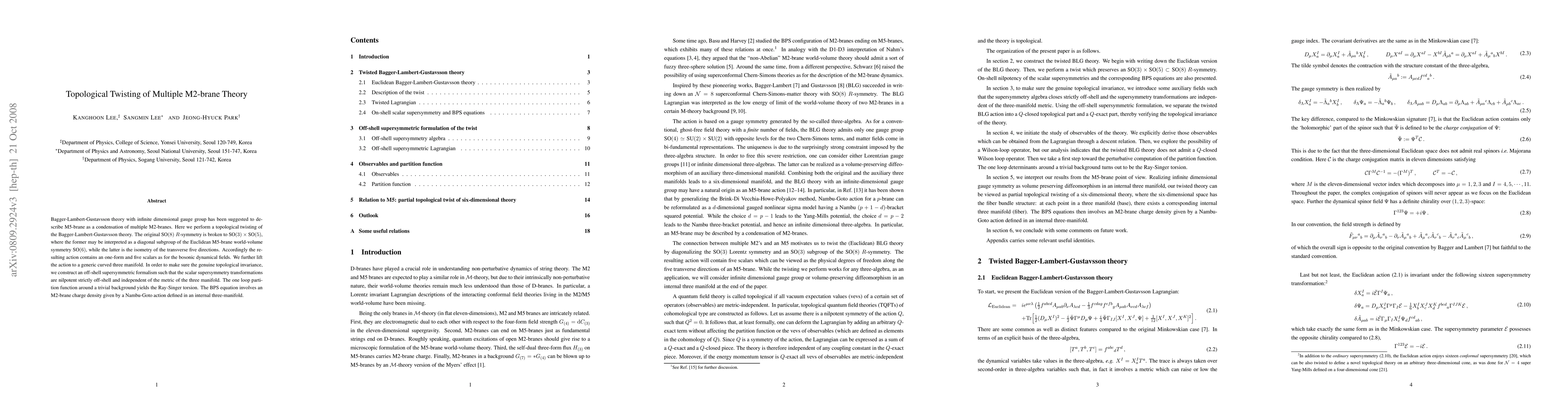Bagger-Lambert-Gustavsson theory with infinite dimensional gauge group has been suggested to describe M5-brane as a condensation of multiple M2-branes. Here we perform a topological twisting of the Bagger-Lambert-Gustavsson theory. The original SO(8) R-symmetry is broken to SO(3)XSO(5), where the former may be interpreted as a diagonal subgroup of the Euclidean M5-brane world-volume symmetry SO(6), while the latter is the isometry of the transverse five directions. Accordingly the resulting action contains an one-form and five scalars as for the bosonic dynamical fields. We further lift the action to a generic curved three manifold. In order to make sure the genuine topological invariance, we construct an off-shell formalism such that the scalar supersymmetry transformations are nilpotent strictly off-shell and independent of the metric of the three manifold. The one loop partition function around a trivial background yields the Ray-Singer torsion. The BPS equation involves an M2-brane charge density given by a Nambu-Goto action defined in an internal three-manifold.