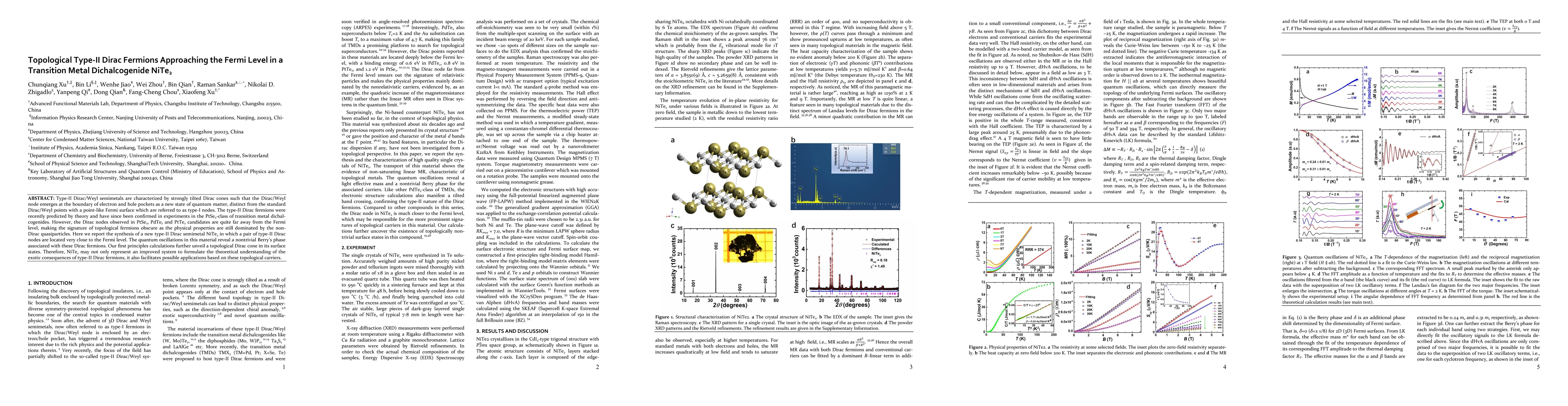 This research reports the synthesis of NiTe2, a type-II Dirac semimetal where type-II Dirac nodes are positioned near the Fermi level, allowing for clear observation of topological fermions' signatures. Quantum oscillations and first principles calculations confirm the presence of nontrivial topological features in NiTe2.