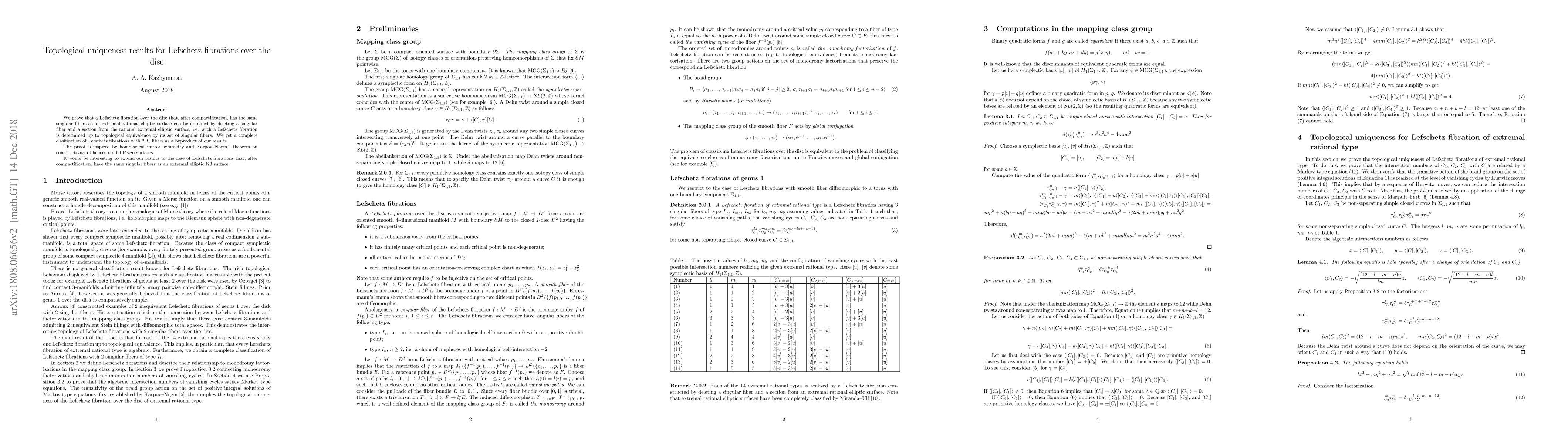 We prove that a Lefschetz fibration over the disc that, after compactification, has the same singular fibers as an extremal rational elliptic surface can be obtained by deleting a singular fiber and a section from the rational extremal elliptic surface, i.e. such a Lefschetz fibration is determined up to topological equivalence by its set of singular fibers. We get a complete clasification of Lefschetz fibrations with 2 $I_1$ fibers as a byproduct of our results. The proof is inspired by homological mirror symmetry and Karpov--Nogin's theorem on constructivity of helices on del Pezzo surfaces. It would be interesting to extend our results to the case of Lefschetz fibrations that, after compactification, have the same singular fibers as an extremal elliptic K3 surface.