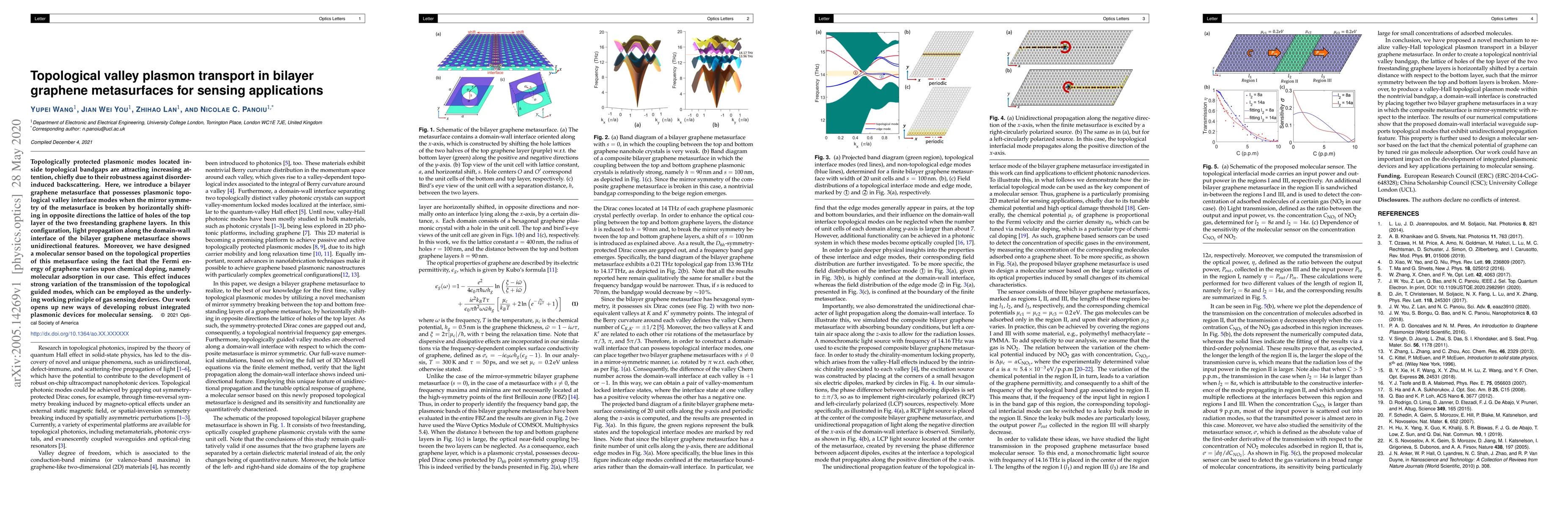 This paper introduces a bilayer graphene metasurface with topological valley plasmonic modes, which exhibit unidirectional light propagation and robustness against disorder. The authors design a molecular sensor leveraging the Fermi energy variation of graphene under chemical doping, enabling robust gas sensing applications.