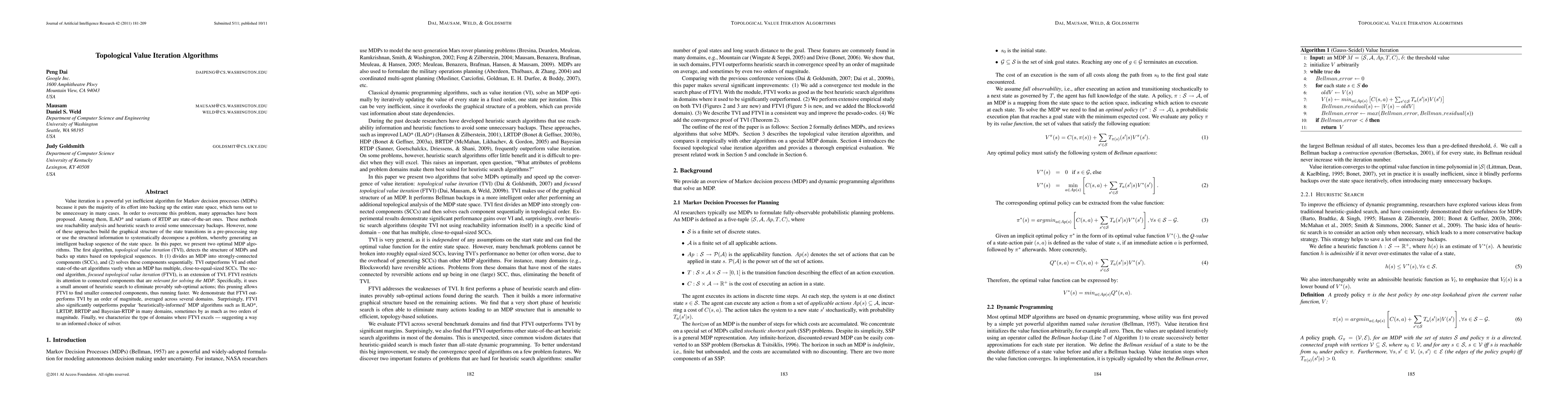 This paper introduces two novel algorithms, topological value iteration (TVI) and focused topological value iteration (FTVI), to efficiently solve Markov decision processes (MDPs). TVI divides MDPs into strongly-connected components and solves them sequentially, while FTVI further prunes irrelevant components using heuristic search, significantly outperforming traditional value iteration and other state-of-the-art algorithms in many domains.