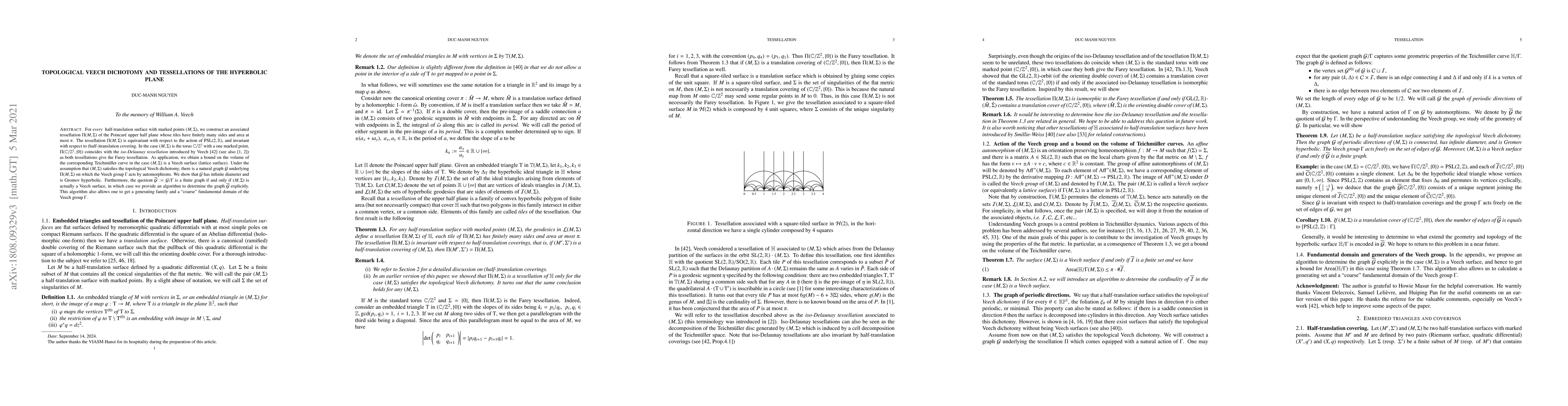 For every half-translation surface with marked points $(M,\Sigma)$, we construct an associated tessellation $\Pi(M,\Sigma)$ of the Poincar\'e upper half plane whose tiles have finitely many sides and area at most $\pi$. The tessellation $\Pi(M,\Sigma)$ is equivariant with respect to the action of $\mathrm{PSL}(2,\mathbb{R})$, and invariant with respect to (half-)translation covering. In the case $(M,\Sigma)$ is the torus $\mathbb{C}/\mathbb{Z}^2$ with a one marked point, $\Pi(\mathbb{C}/\mathbb{Z}^2,\{0\})$ coincides with the iso-Delaunay tessellation introduced by Veech as both tessellations give the Farey tessellation. As application, we obtain a bound on the volume of the corresponding Teichm\"uller curve in the case $(M,\Sigma)$ is a Veech surface (lattice surface). Under the assumption that $(M,\Sigma)$ satisfies the topological Veech dichotomy, there is a natural graph $\mathcal{G}$ underlying $\Pi(M,\Sigma)$ on which the Veech group $\Gamma$ acts by automorphisms. We show that $\mathcal{G}$ has infinite diameter and is Gromov hyperbolic. Furthermore, the quotient $\overline{\mathcal{G}}:=\mathcal{G}/\Gamma$ is a finite graph if and only if $(M,\Sigma)$ is actually a Veech surface, in which case we provide an algorithm to determine the graph $\overline{\mathcal{G}}$ explicitly. This algorithm also allows one to get a generating family and a "coarse" fundamental domain of the Veech group $\Gamma$.