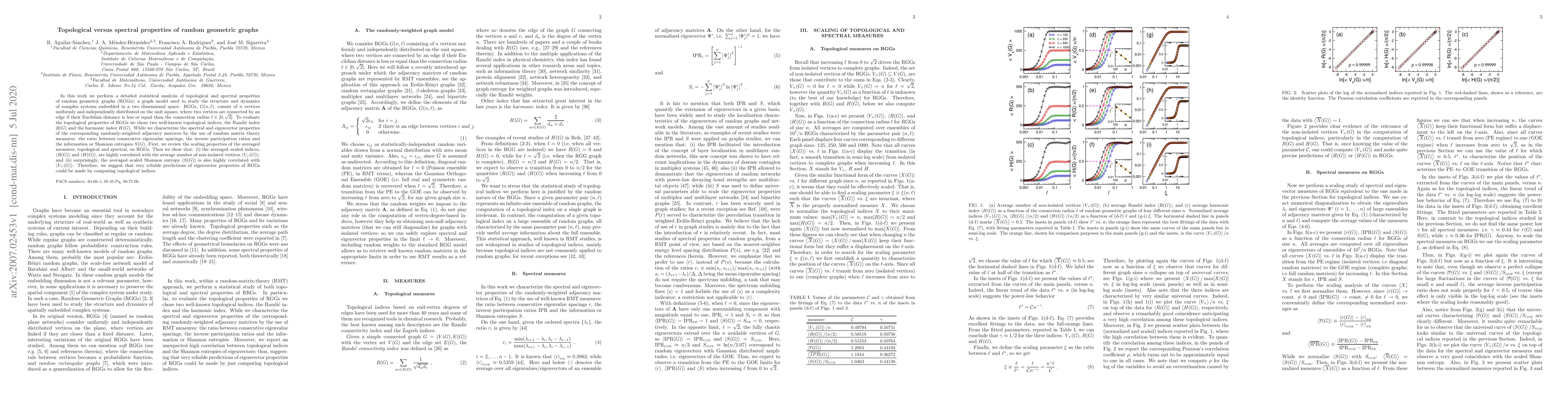 In this work we perform a detailed statistical analysis of topological and spectral properties of random geometric graphs (RGGs); a graph model used to study the structure and dynamics of complex systems embedded in a two dimensional space. RGGs, $G(n,\ell)$, consist of $n$ vertices uniformly and independently distributed on the unit square, where two vertices are connected by an edge if their Euclidian distance is less or equal than the connection radius $\ell \in [0,\sqrt{2}]$. To evaluate the topological properties of RGGs we chose two well-known topological indices, the Randi\'c index $R(G)$ and the harmonic index $H(G)$. While we characterize the spectral and eigenvector properties of the corresponding randomly-weighted adjacency matrices by the use of random matrix theory measures: the ratio between consecutive eigenvalue spacings, the inverse participation ratios and the information or Shannon entropies $S(G)$. First, we review the scaling properties of the averaged measures, topological and spectral, on RGGs. Then we show that: (i) the averaged--scaled indices, $\left\langle R(G) \right\rangle$ and $\left\langle H(G) \right\rangle$, are highly correlated with the average number of non-isolated vertices $\left\langle V_\times(G) \right\rangle$; and (ii) surprisingly, the averaged--scaled Shannon entropy $\left\langle S(G) \right\rangle$ is also highly correlated with $\left\langle V_\times(G) \right\rangle$. Therefore, we suggest that very reliable predictions of eigenvector properties of RGGs could be made by computing topological indices.