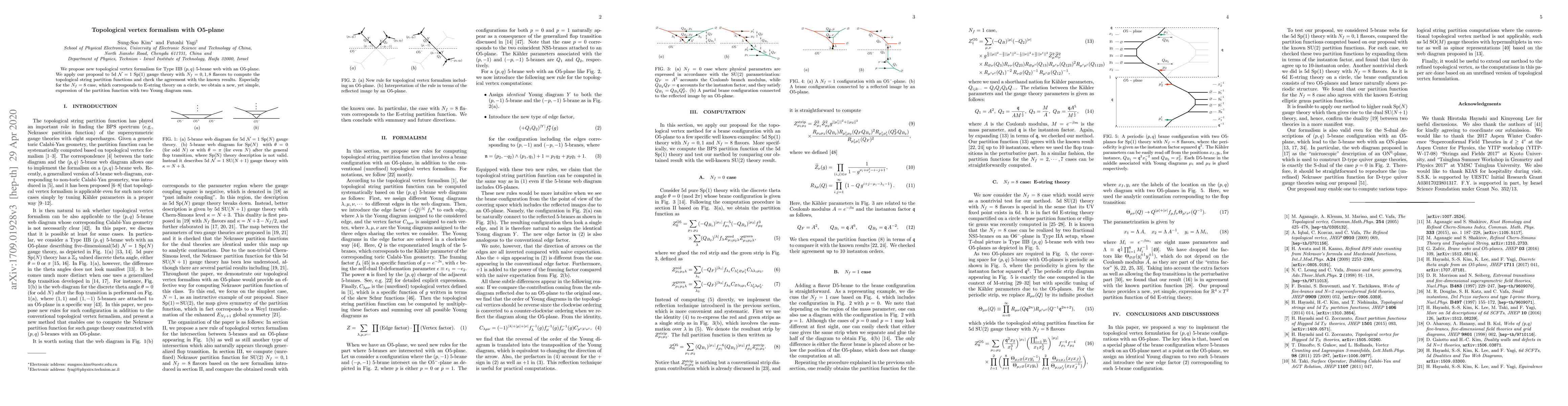 This paper introduces a novel topological vertex formalism for Type IIB $(p,q)$ 5-brane webs incorporating an O5-plane, and applies it to 5d $\mathcal{N}=1$ Sp(1) gauge theories with varying flavor numbers to compute topological string partition functions, confirming results especially for the $N_f=8$ case with a new, simplified partition function expression.