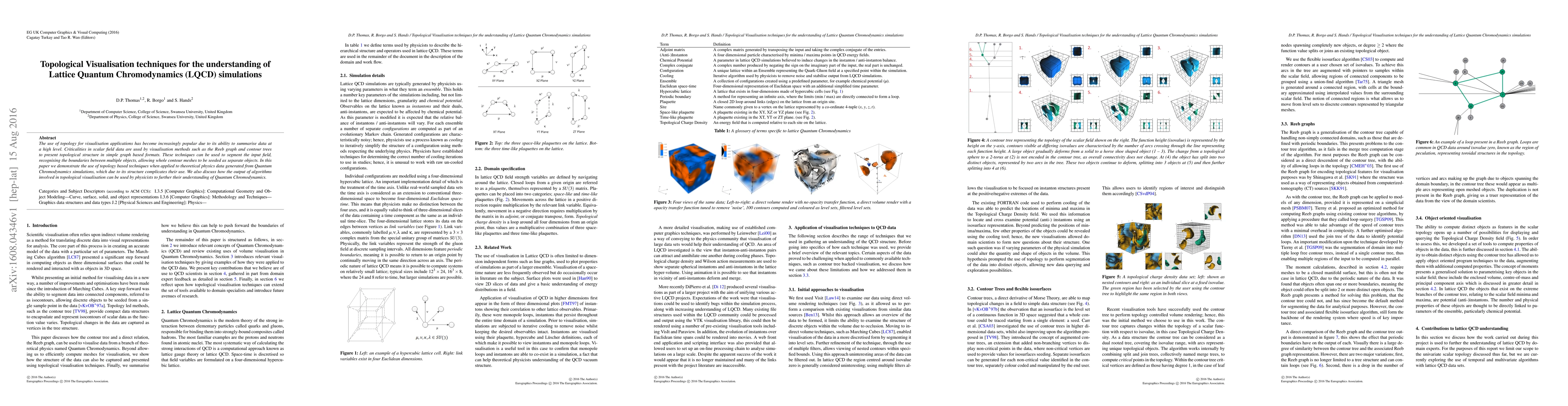 The use of topology for visualisation applications has become increasingly popular due to its ability to summarise data at a high level. Criticalities in scalar field data are used by visualisation methods such as the Reeb graph and contour trees to present topological structure in simple graph based formats. These techniques can be used to segment the input field, recognising the boundaries between multiple objects, allowing whole contour meshes to be seeded as separate objects. In this paper we demonstrate the use of topology based techniques when applied to theoretical physics data generated from Quantum Chromodynamics simulations, which due to its structure complicates their use. We also discuss how the output of algorithms involved in topological visualisation can be used by physicists to further their understanding of Quantum Chromodynamics.