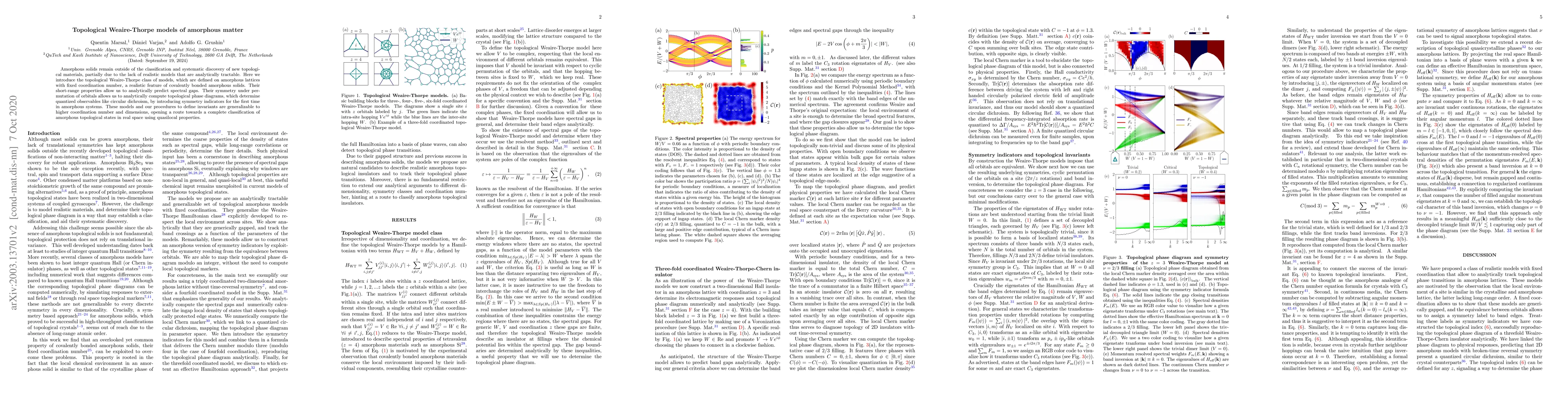 Amorphous solids remain outside of the classification and systematic discovery of new topological materials, partially due to the lack of realistic models that are analytically tractable. Here we introduce the topological Weaire-Thorpe class of models, which are defined on amorphous lattices with fixed coordination number, a realistic feature of covalently bonded amorphous solids. Their short-range properties allow us to analytically predict spectral gaps. Their symmetry under permutation of orbitals allows us to analytically compute topological phase diagrams, which determine quantized observables like circular dichroism, by introducing symmetry indicators for the first time in amorphous systems. These models and our procedures to define invariants are generalizable to higher coordination number and dimensions, opening a route towards a complete classification of amorphous topological states in real space using quasilocal properties.