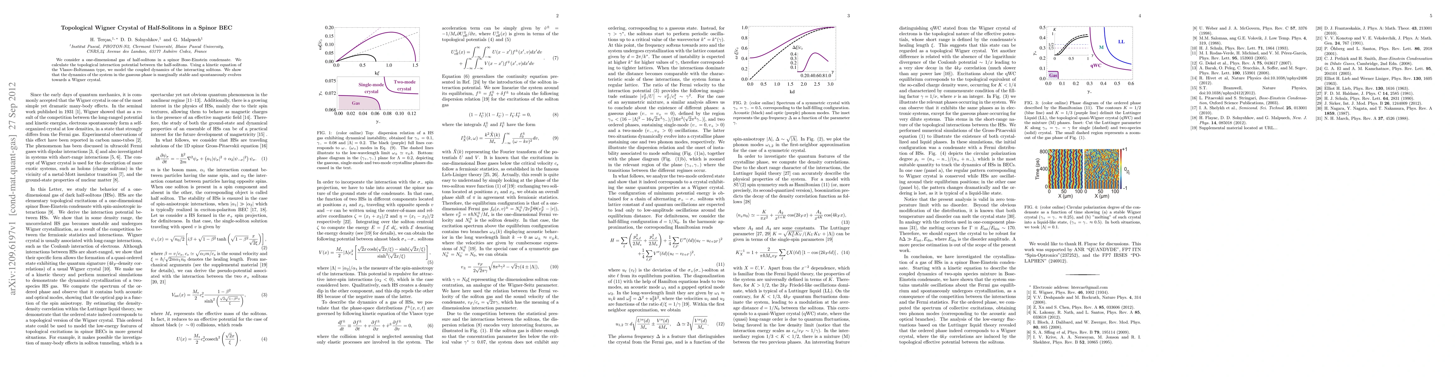We consider a one-dimensional gas of half-solitons in a spinor Bose-Einstein condensate. We calculate the topological interaction potential between the half-solitons. Using a kinetic equation of the Vlasov-Boltzmann type, we model the coupled dynamics of the interacting solitons. We show that the dynamics of the system in the gaseous phase is marginally stable and spontaneously evolves towards a Wigner crystal.