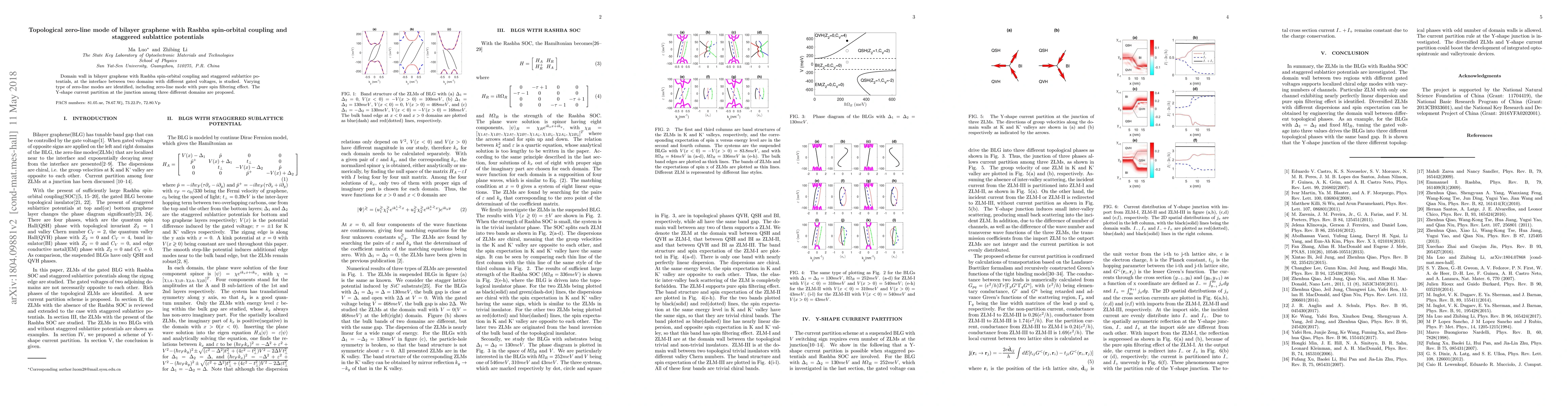 This paper investigates domain walls in bilayer graphene with Rashba spin-orbital coupling and staggered sublattice potentials, identifying various zero-line modes, including those with pure spin filtering effects. It proposes a Y-shaped current partition at junctions between three different domains.