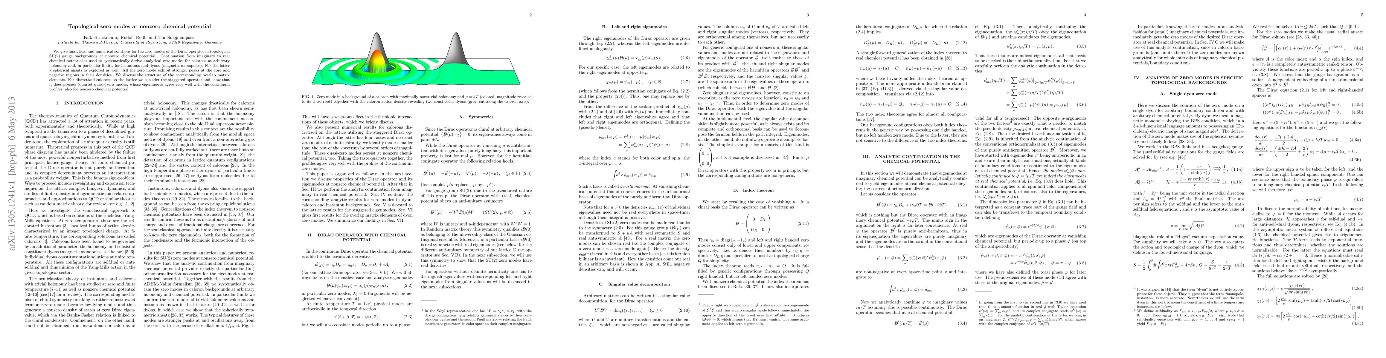 We give analytical and numerical solutions for the zero modes of the Dirac operator in topological SU(2) gauge backgrounds at nonzero chemical potential. Continuation from imaginary to real chemical potential is used to systematically derive analytical zero modes for calorons at arbitrary holonomy and, in particular limits, for instantons and dyons (magnetic monopoles). For the latter a spherical ansatz is explored as well. All the zero mode exhibit stronger peaks at the core and negative regions in their densities. We discuss the structure of the corresponding overlap matrix elements. For discretized calorons on the lattice we consider the staggered operator and show that it does possess (quartet quasi-)zero modes, whose eigenmodes agree very well with the continuum profiles, also for nonzero chemical potential.