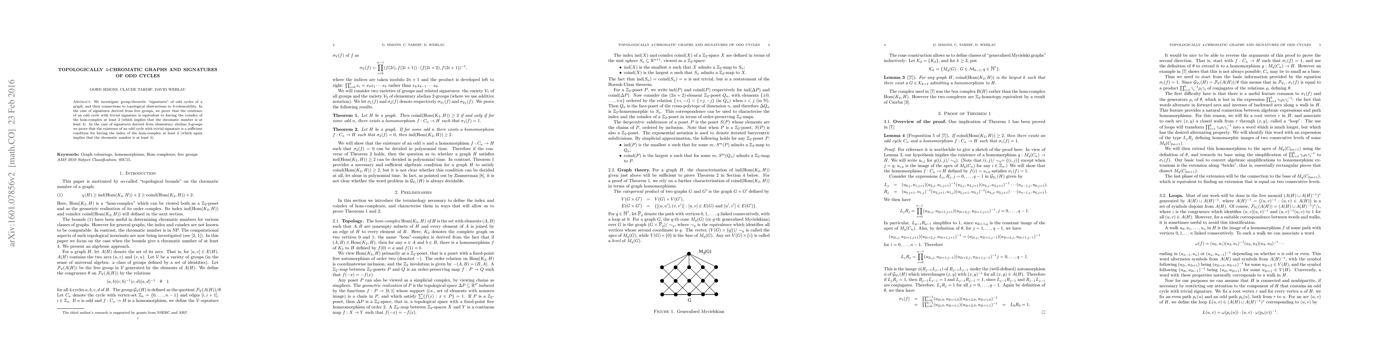 The paper investigates group-theoretic 'signatures' of odd cycles in graphs, connecting them to topological obstructions to 3-colorability. It proves results for signatures derived from free groups and elementary abelian 2-groups, establishing conditions under which the chromatic number is at least 4.