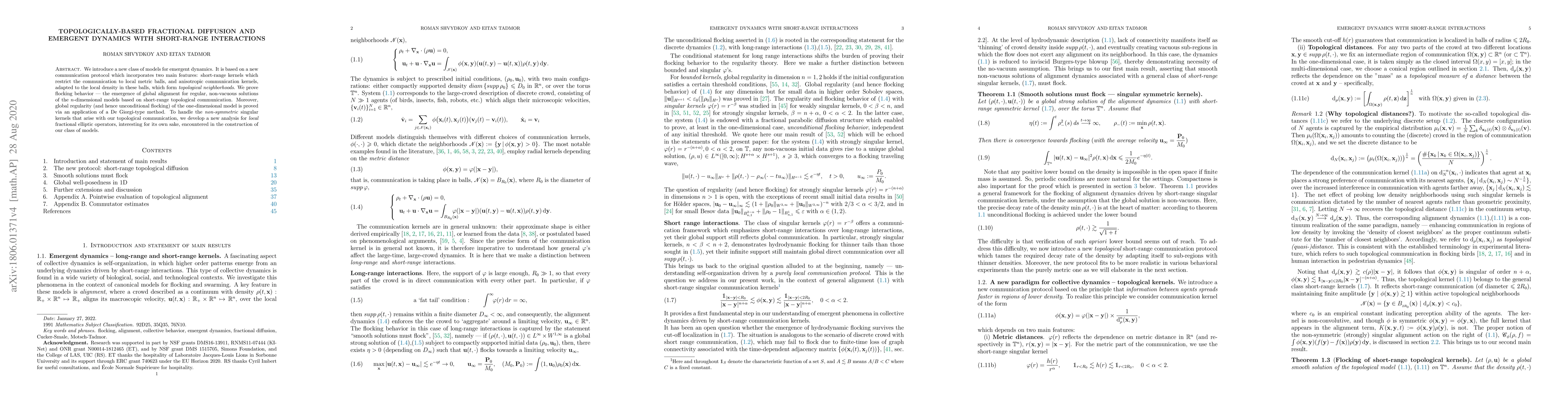 Researchers introduce a new model for emergent dynamics based on short-range topological communication, proving flocking behavior in 1D models via De Giorgi-type methods.