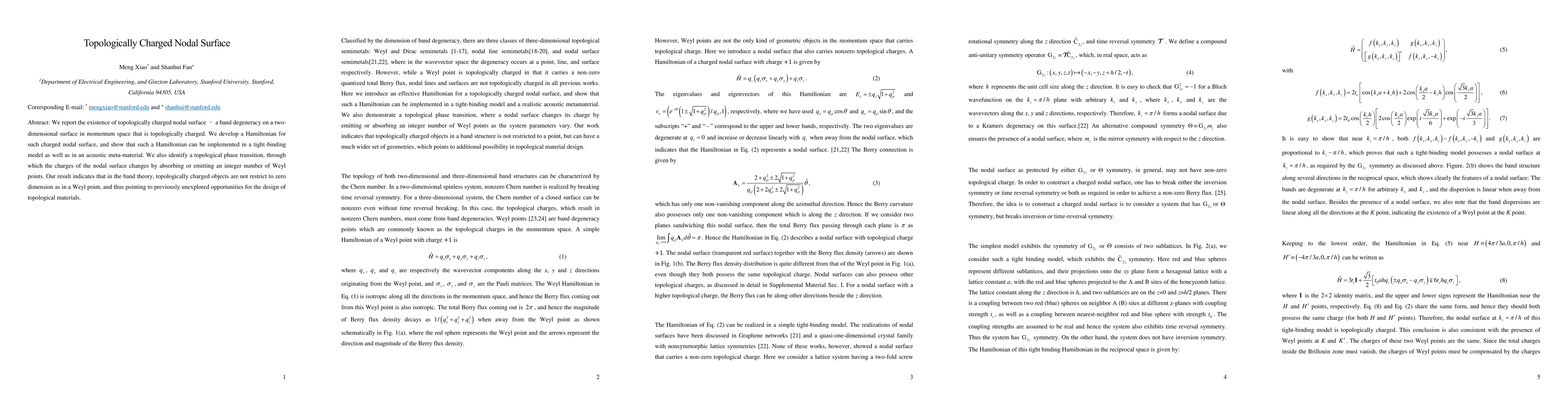 This paper reports the discovery of topologically charged nodal surfaces, demonstrating their existence in a two-dimensional momentum space and presenting a Hamiltonian model for them. It also explores their implementation in tight-binding models and acoustic meta-materials, revealing a topological phase transition that changes the nodal surface's charge by absorbing or emitting Weyl points, thus expanding the scope of topological materials design beyond zero-dimensional objects.