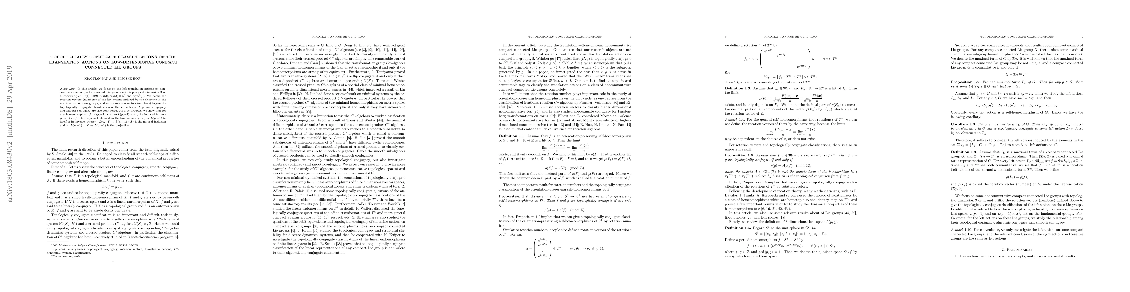 In this article, we focus on the left translation actions on noncommutative compact connected Lie groups with topological dimension 3 or 4, consisting of ${\rm SU}(2),\,{\rm U}(2),\,{\rm SO}(3),\,{\rm SO}(3) \times S^1$ and ${{\rm Spin}}^{\mathbb{C}}(3)$. We define the rotation vectors (numbers) of the left actions induced by the elements in the maximal tori of these groups, and utilize rotation vectors (numbers) to give the topologically conjugate classification of the left actions. Algebraic conjugacy and smooth conjugacy are also considered. As a by-product, we show that for any homeomorphism $f:L(p, -1)\times S^1\rightarrow L(p, -1)\times S^1$, the induced isomorphism $(\pi\circ f\circ i)_*$ maps each element in the fundamental group of $L(p, -1)$ to itself or its inverse, where $i:L(p,-1)\rightarrow L(p, -1)\times S^1$ is the natural inclusion and $\pi:L(p, -1)\times S^1\rightarrow L(p, -1)$ is the projection.