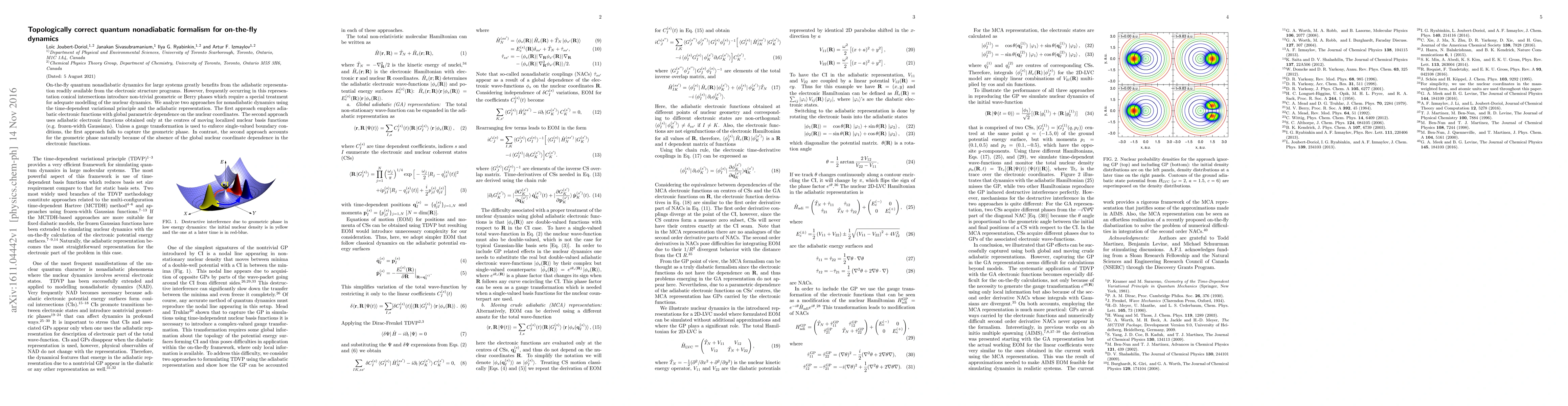 On-the-fly quantum nonadiabatic dynamics for large systems greatly benefits from the adiabatic representation readily available from the electronic structure programs. However, frequently occurring in this representation conical intersections introduce non-trivial geometric or Berry phases which require a special treatment for adequate modelling of the nuclear dynamics. We analyze two approaches for nonadiabatic dynamics using the time-dependent variational principle and the adiabatic representation. The first approach employs adiabatic electronic functions with global parametric dependence on the nuclear coordinates. The second approach uses adiabatic electronic functions obtained only at the centres of moving localized nuclear basis functions (e.g. frozen-width Gaussians). Unless a gauge transformation is used to enforce single-valued boundary conditions, the first approach fails to capture the geometric phase. In contrast, the second approach accounts for the geometric phase naturally because of the absence of the global nuclear coordinate dependence in the electronic functions.
