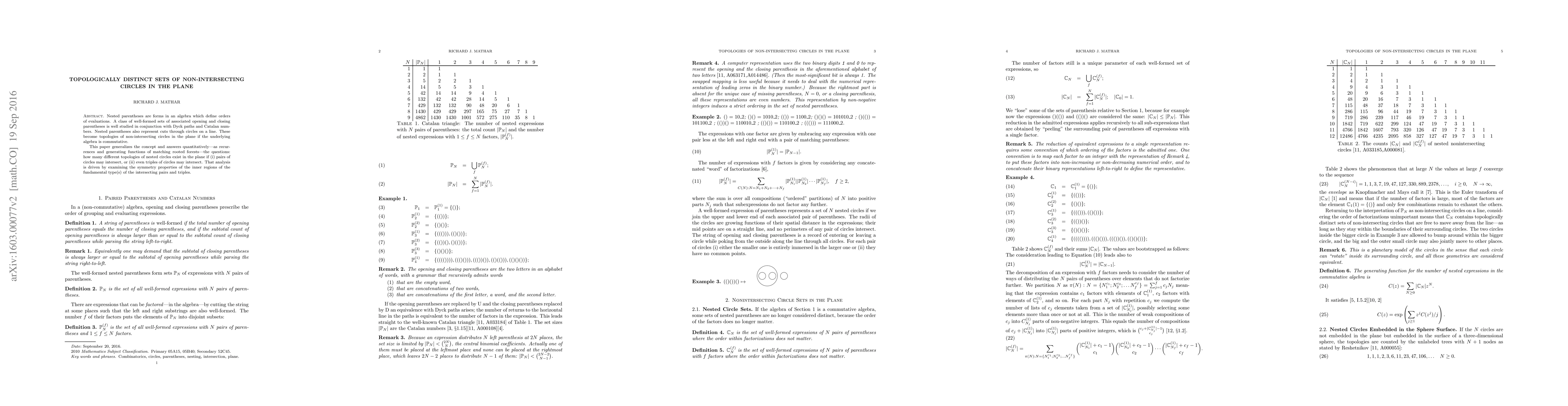 This paper explores topologies of non-intersecting circles in the plane through nested parentheses, extending the analysis to configurations where pairs or triples of circles may intersect, using recurrences and generating functions to quantify these arrangements. The study focuses on the symmetry properties of intersecting circle arrangements.