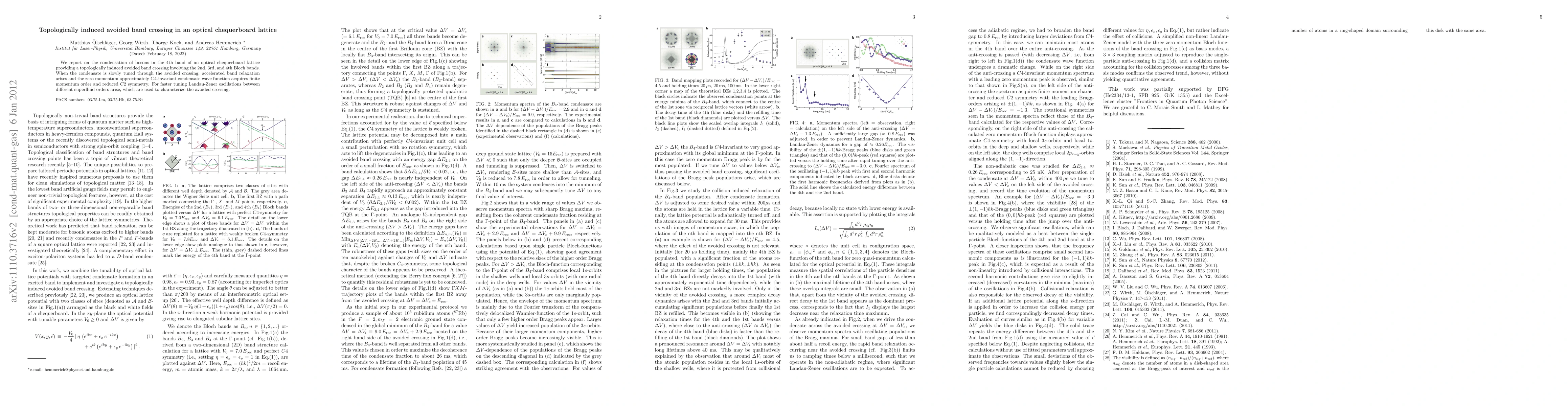 This research investigates the condensation of bosons in the 4th band of an optical chequerboard lattice, revealing a topologically induced avoided band crossing. The study finds that rapid tuning through the crossing leads to Landau-Zener oscillations between different superfluid orders, revealing the dynamics of the band relaxation and symmetry changes.