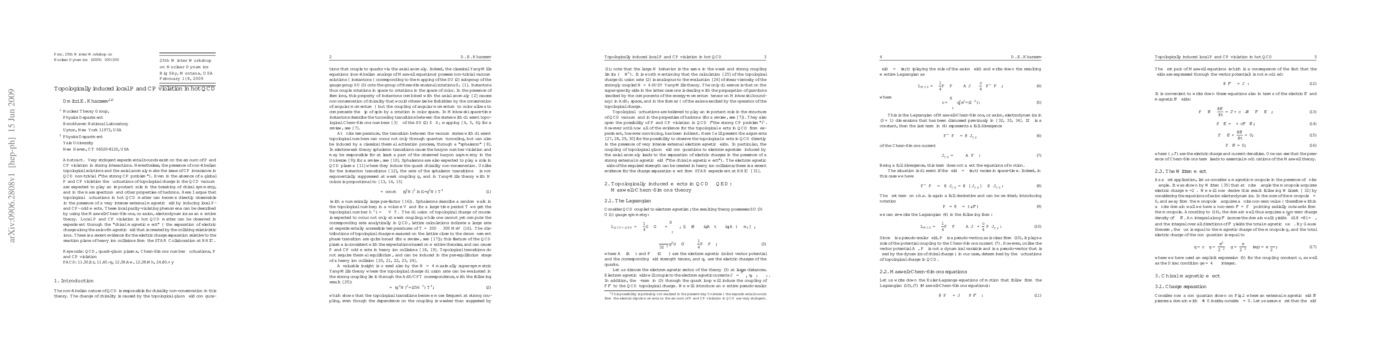 Very stringent experimental bounds exist on the amount of P and CP violation in strong interactions. Nevertheless, the presence of non-Abelian topological solutions and the axial anomaly make the issue of CP invariance in QCD non-trivial ("the strong CP problem"). Even in the absence of a global P and CP violation the fluctuations of topological charge in the QCD vacuum are expected to play an important role in the breaking of chiral symmetry, and in the mass spectrum and other properties of hadrons. Here I argue that topological fluctuations in hot QCD matter can become directly observable in the presence of a very intense external magnetic field by inducing local P- and CP- odd effects. These local parity-violating phenomena can be described by using the Maxwell-Chern-Simons, or axion, electrodynamics as an effective theory. Local P and CP violation in hot QCD matter can be observed in experiment through the "chiral magnetic effect" - the separation of electric charge along the axis of magnetic field that is created by the colliding relativistic ions. There is a recent evidence for the electric charge separation relative to the reaction plane of heavy ion collisions from the STAR Collaboration at RHIC.