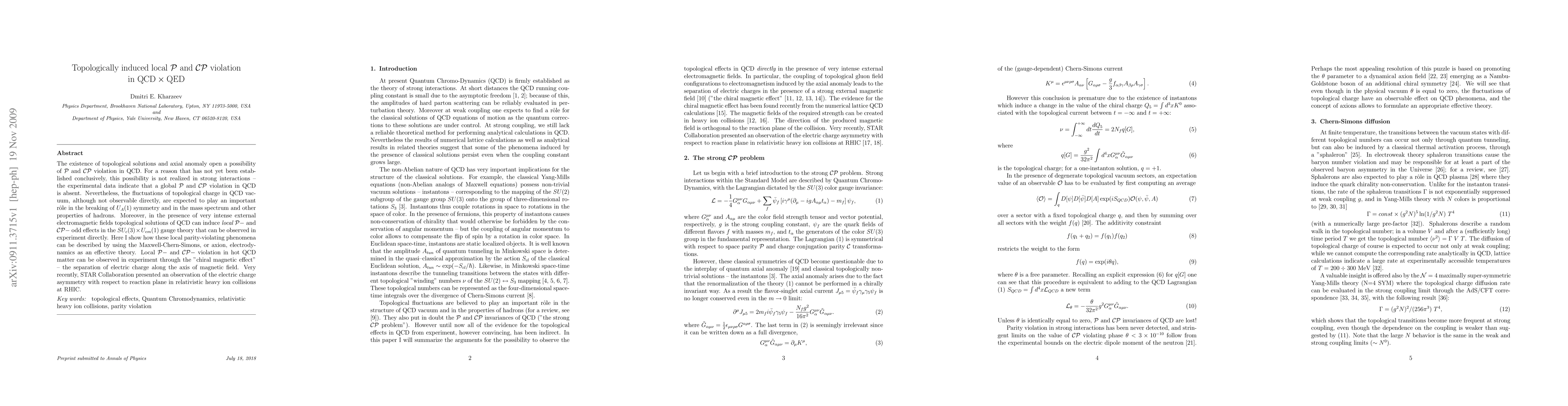 The existence of topological solutions and axial anomaly open a possibility of P and CP violation in QCD. For a reason that has not yet been established conclusively, this possibility is not realized in strong interactions - the experimental data indicate that a global P and CP violation in QCD is absent. Nevertheless, the fluctuations of topological charge in QCD vacuum, although not observable directly, are expected to play an important role in the breaking of $U_A(1)$ symmetry and in the mass spectrum and other properties of hadrons. Moreover, in the presence of very intense external electromagnetic fields topological solutions of QCD can induce local P- and CP-odd effects in the $SU_c(3)\times U_{em}(1)$ gauge theory that can be observed in experiment directly. Here I show how these local parity-violating phenomena can be described by using the Maxwell-Chern-Simons, or axion, electrodynamics as an effective theory. Local P- and CP- violation in hot QCD matter can be observed in experiment through the "chiral magnetic effect" - the separation of electric charge along the axis of magnetic field. Very recently, STAR Collaboration presented an observation of the electric charge asymmetry with respect to reaction plane in relativistic heavy ion collisions at RHIC.