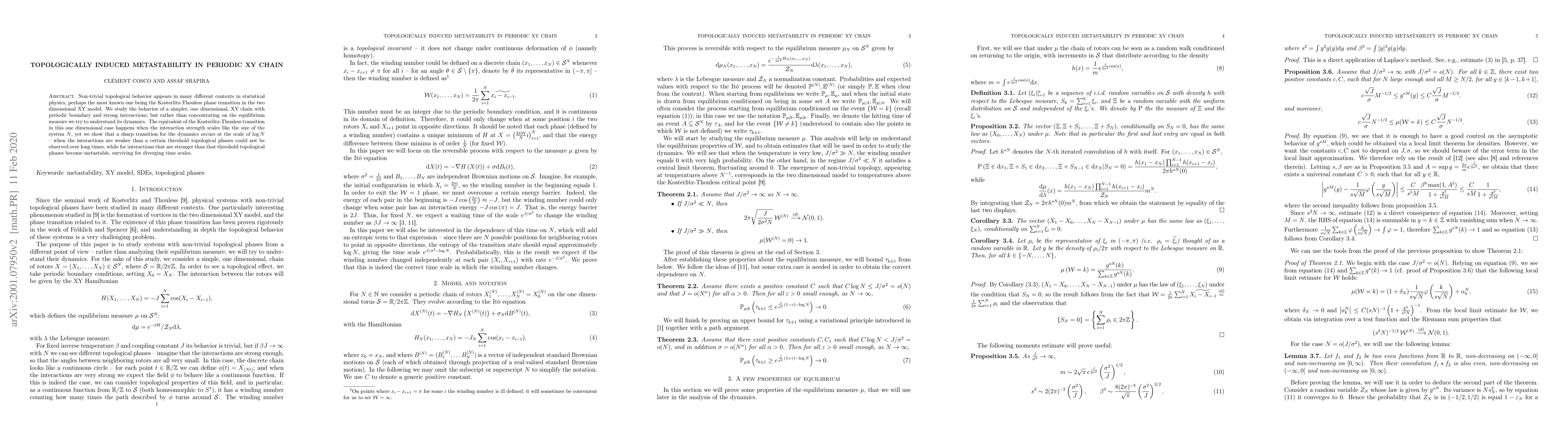 Non-trivial topological behavior appears in many different contexts in statistical physics, perhaps the most known one being the Kosterlitz-Thouless phase transition in the two dimensional XY model. We study the behavior of a simpler, one dimensional, XY chain with periodic boundary and strong interactions; but rather than concentrating on the equilibrium measure we try to understand its dynamics. The equivalent of the Kosterlitz-Thouless transition in this one dimensional case happens when the interaction strength scales like the size of the system $N$, yet we show that a sharp transition for the dynamics occurs at the scale of $\log N$ -- when the interactions are weaker than a certain threshold topological phases could not be observed over long times, while for interactions that are stronger than that threshold topological phases become metastable, surviving for diverging time scales.