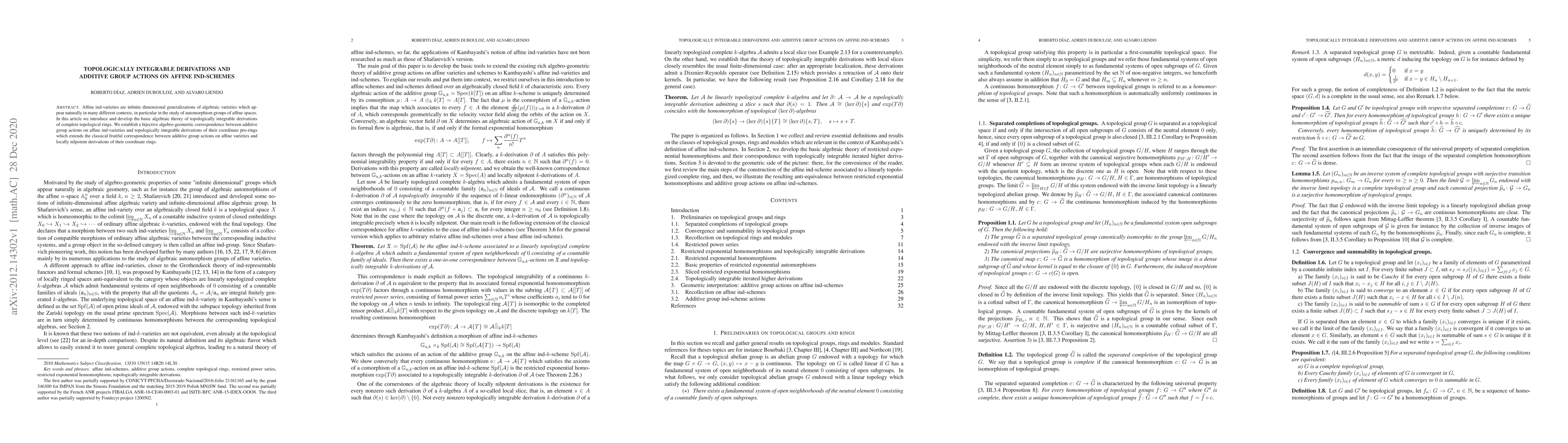 This paper develops the theory of topologically integrable derivations for complete topological rings and establishes a correspondence between additive group actions on affine ind-varieties and these derivations, extending the classical link between such actions on affine varieties and locally nilpotent derivations.