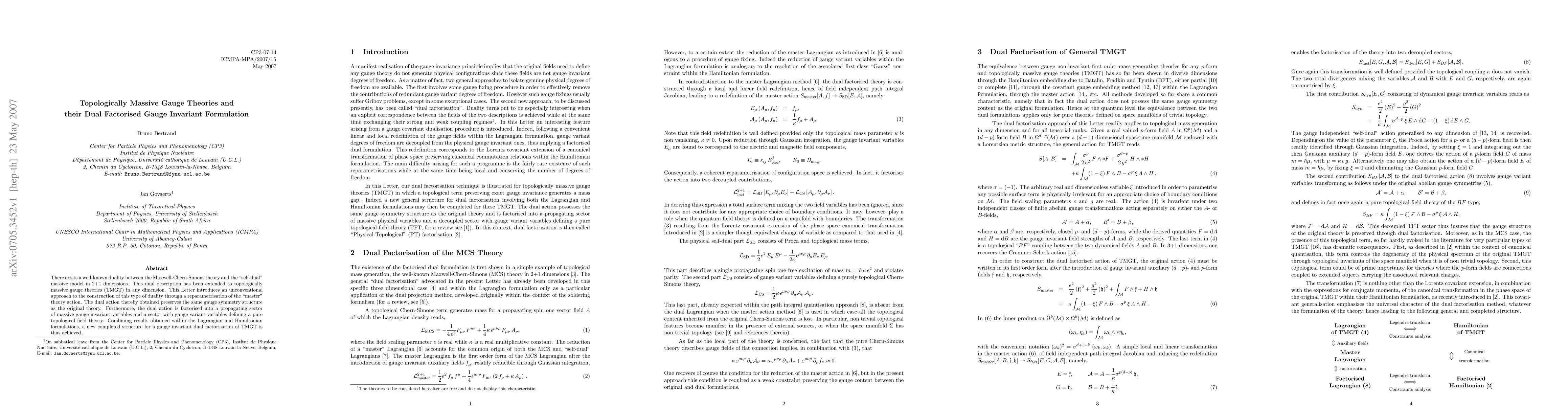 There exists a well-known duality between the Maxwell-Chern-Simons theory and the self-dual massive model in 2+1 dimensions. This dual description has been extended to topologically massive gauge theories (TMGT) in any dimension. This Letter introduces an unconventional approach to the construction of this type of duality through a reparametrisation of the master theory action. The dual action thereby obtained preserves the same gauge symmetry structure as the original theory. Furthermore, the dual action is factorised into a propagating sector of massive gauge invariant variables and a sector with gauge variant variables defining a pure topological field theory. Combining results obtained within the Lagrangian and Hamiltonian formulations, a new completed structure for a gauge invariant dual factorisation of TMGT is thus achieved.