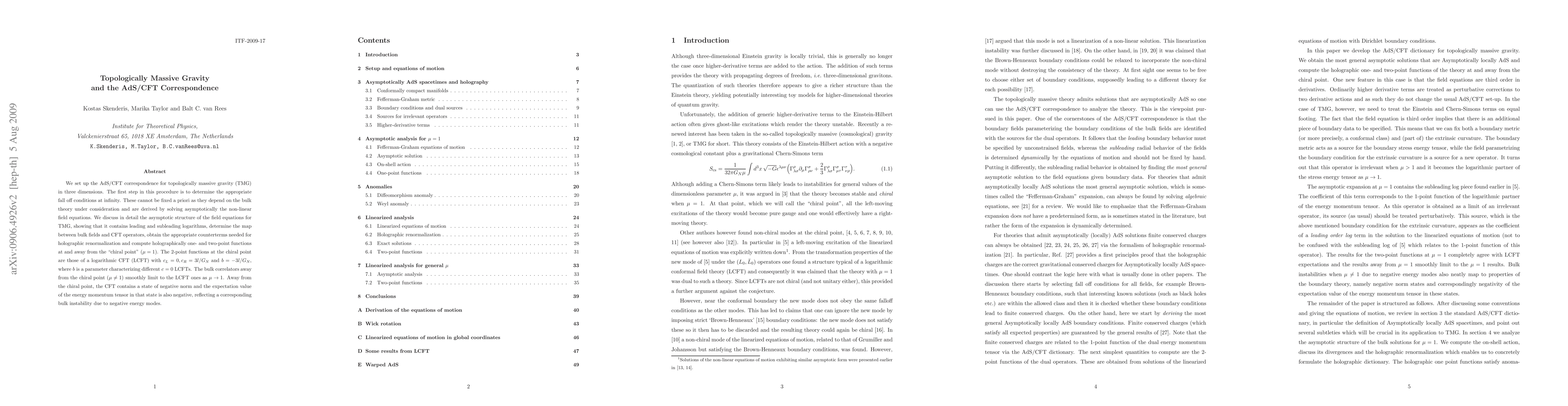 This paper establishes the AdS/CFT correspondence for topologically massive gravity in three dimensions, deriving fall-off conditions and mapping bulk fields to conformal field theory operators. It computes holographic correlators and finds that the CFT at the 'chiral point' exhibits logarithmic behavior, while away from this point, the CFT shows negative norm states and bulk instabilities.