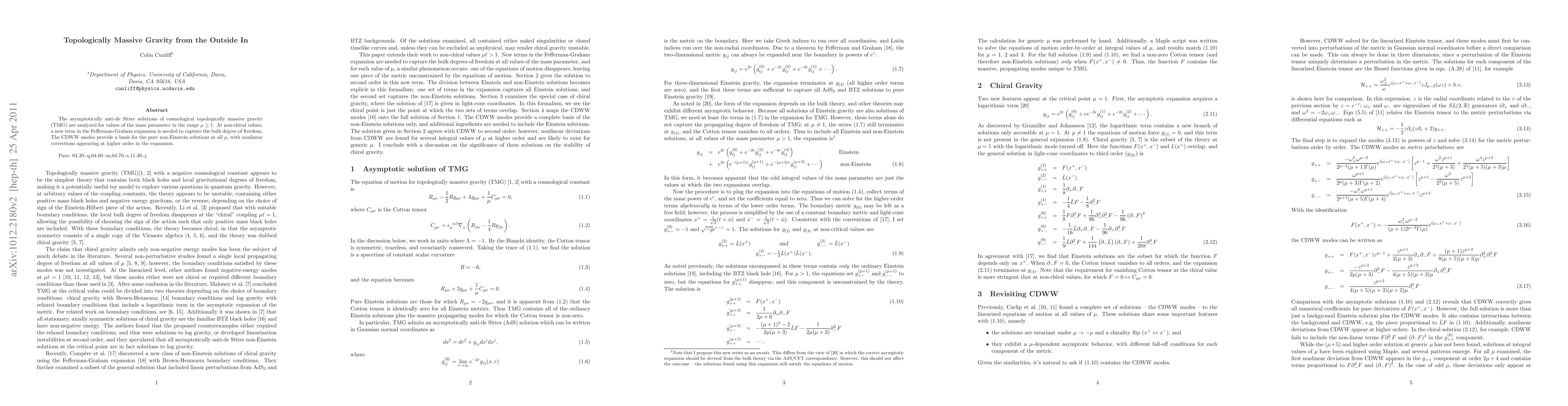 The asymptotic solutions of cosmological topologically massive gravity (TMG) are analyzed for values of the mass parameter in the range $\mu\geq1$. At non-chiral values, a new term in the Fefferman-Graham expansion is needed to capture the bulk degree of freedom. The CDWW modes provide a basis for the pure non-Einstein solutions at all $\mu$, with nonlinear corrections appearing at higher order in the expansion.