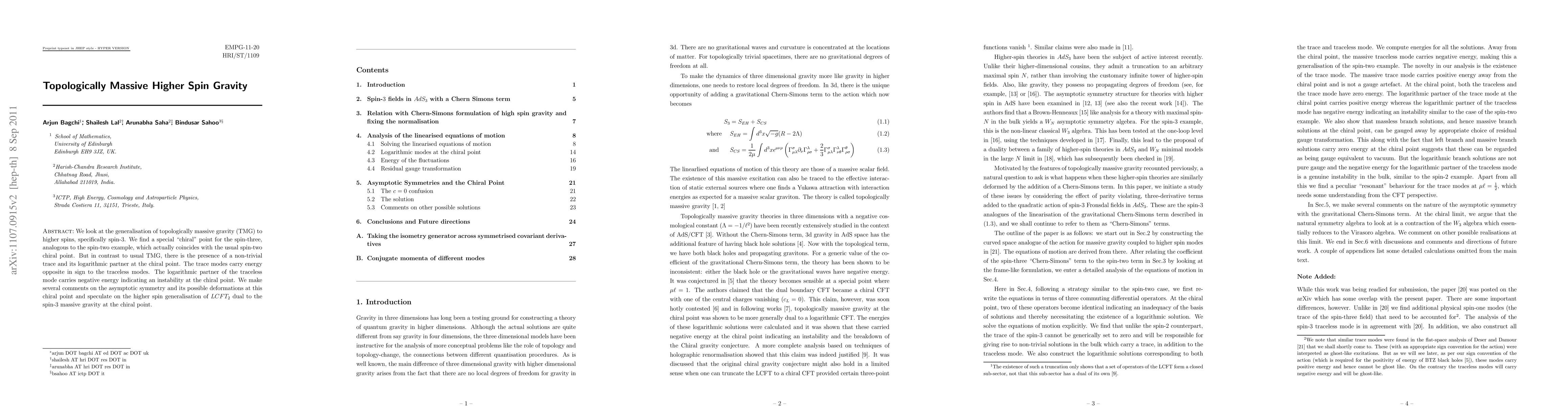 This paper extends topologically massive gravity to higher spin fields, focusing on spin-3. It identifies a chiral point analogous to that in spin-2 TMG, featuring a non-trivial trace and its logarithmic partner, with the trace modes carrying opposite-sign energy compared to traceless modes, indicating instability.