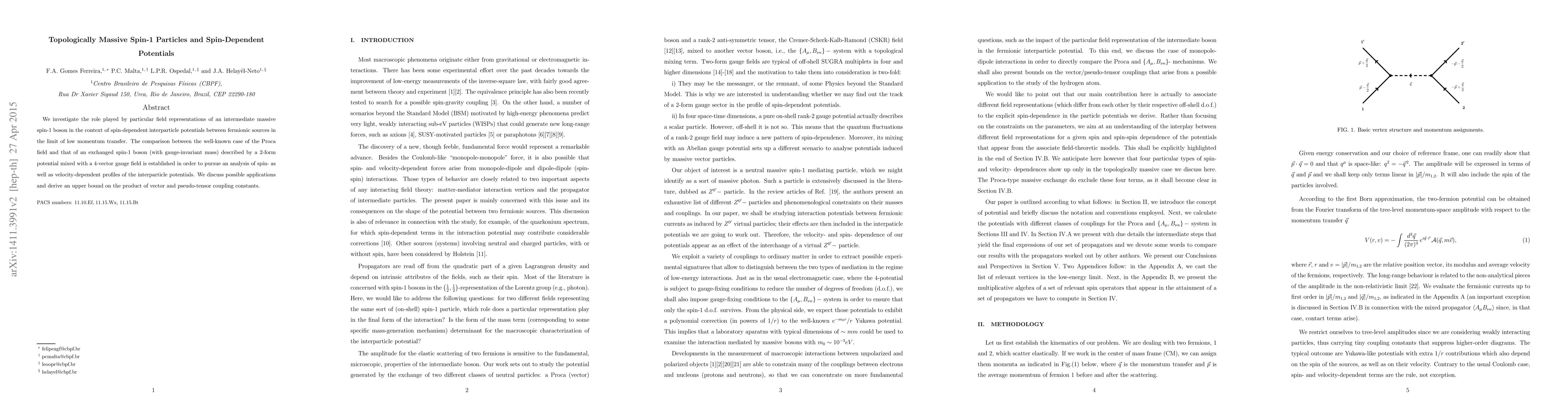 This paper explores the spin-dependent interparticle potentials from massive spin-1 bosons, comparing the Proca field with a 2-form potential mixed with a 4-vector gauge field, and derives an upper bound on the coupling constants for vector and pseudo-tensor interactions.
