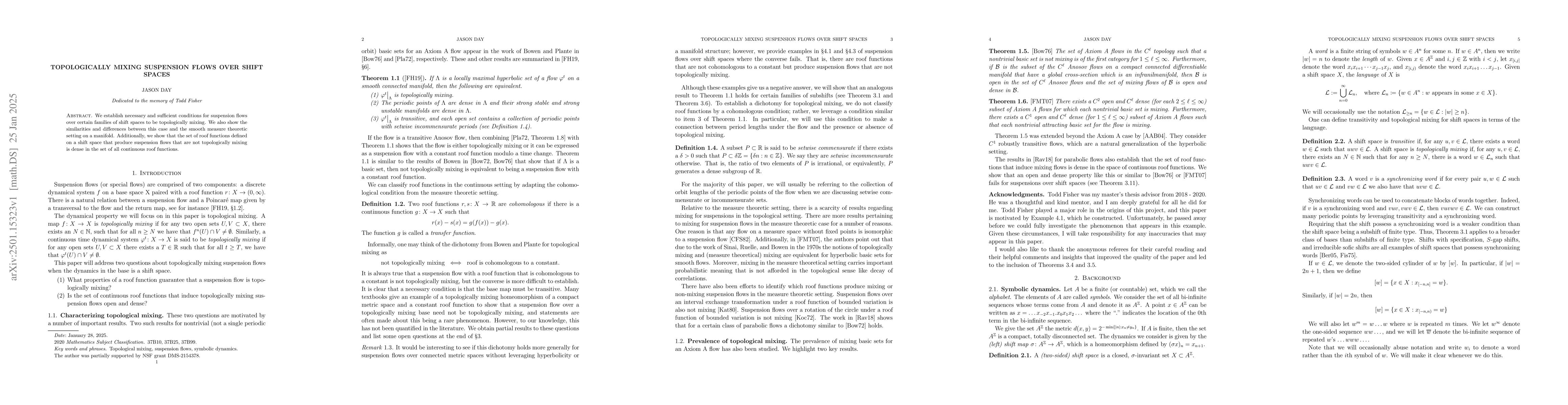 This paper identifies conditions for suspension flows over shift spaces to be topologically mixing and compares these conditions to the smooth measure-theoretic setting. It also demonstrates that non-mixing flows arise densely among all continuous roof functions.
