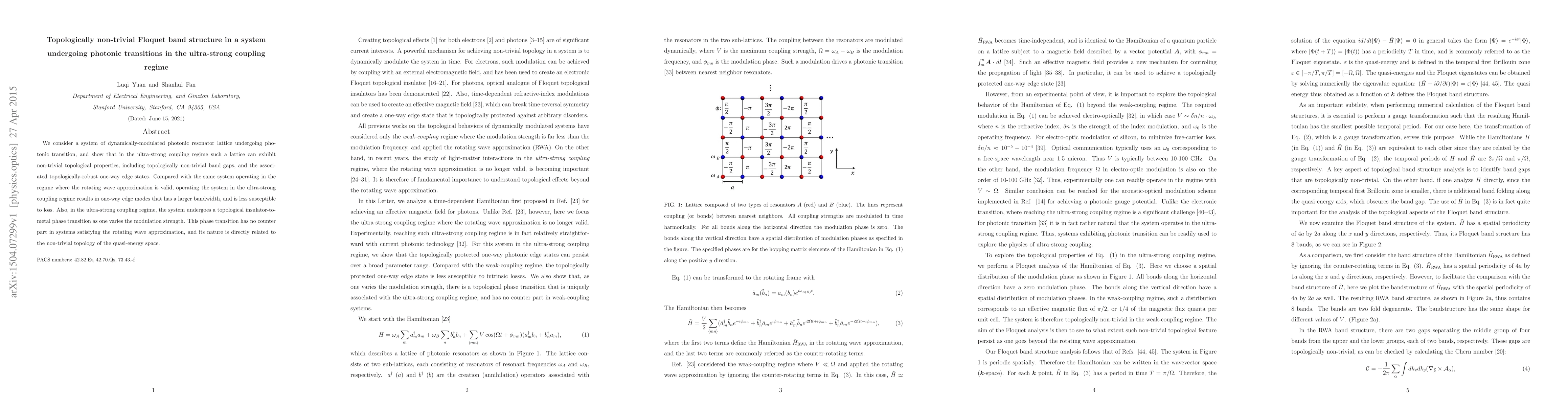 We consider a system of dynamically-modulated photonic resonator lattice undergoing photonic transition, and show that in the ultra-strong coupling regime such a lattice can exhibit non-trivial topological properties, including topologically non-trivial band gaps, and the associated topologically-robust one-way edge states. Compared with the same system operating in the regime where the rotating wave approximation is valid, operating the system in the ultra-strong coupling regime results in one-way edge modes that has a larger bandwidth, and is less susceptible to loss. Also, in the ultra-strong coupling regime, the system undergoes a topological insulator-to-metal phase transition as one varies the modulation strength. This phase transition has no counter part in systems satisfying the rotating wave approximation, and its nature is directly related to the non-trivial topology of the quasi-energy space.