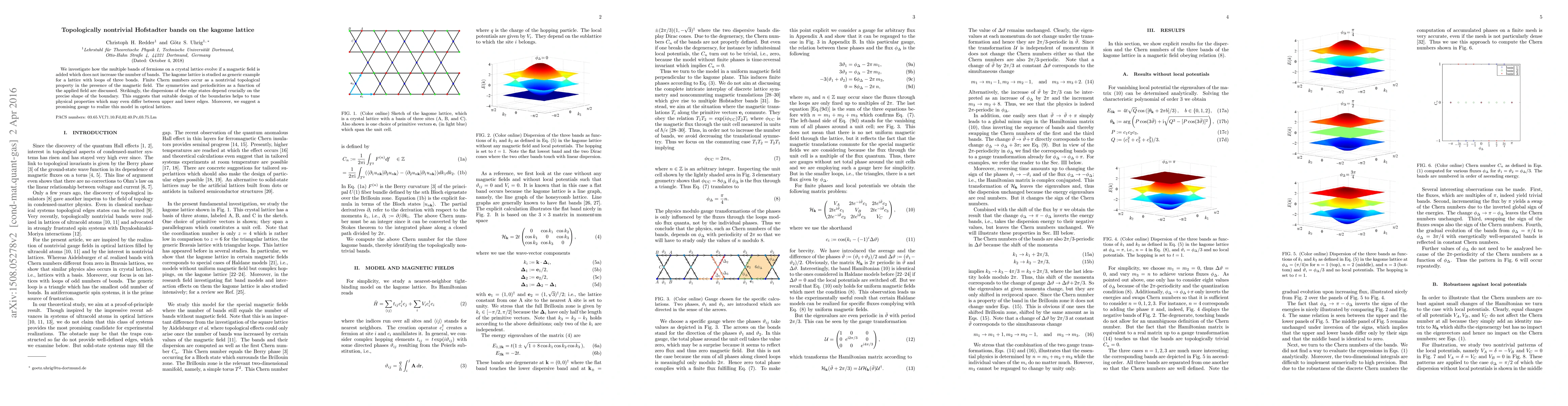 We investigate how the multiple bands of fermions on a crystal lattice evolve if a magnetic field is added which does not increase the number of bands. The kagome lattice is studied as generic example for a lattice with loops of three bonds. Finite Chern numbers occur as non-trivial topological property in presence of the magnetic field. The symmetries and periodicities as function of the applied field are discussed. Strikingly, the dispersions of the edge states depend crucially on the precise shape of the boundary. This suggests that suitable design of the boundaries helps to tune physical properties which may even differ between upper and lower edge. Moreover, we suggest a promising gauge to realize this model in optical lattices.