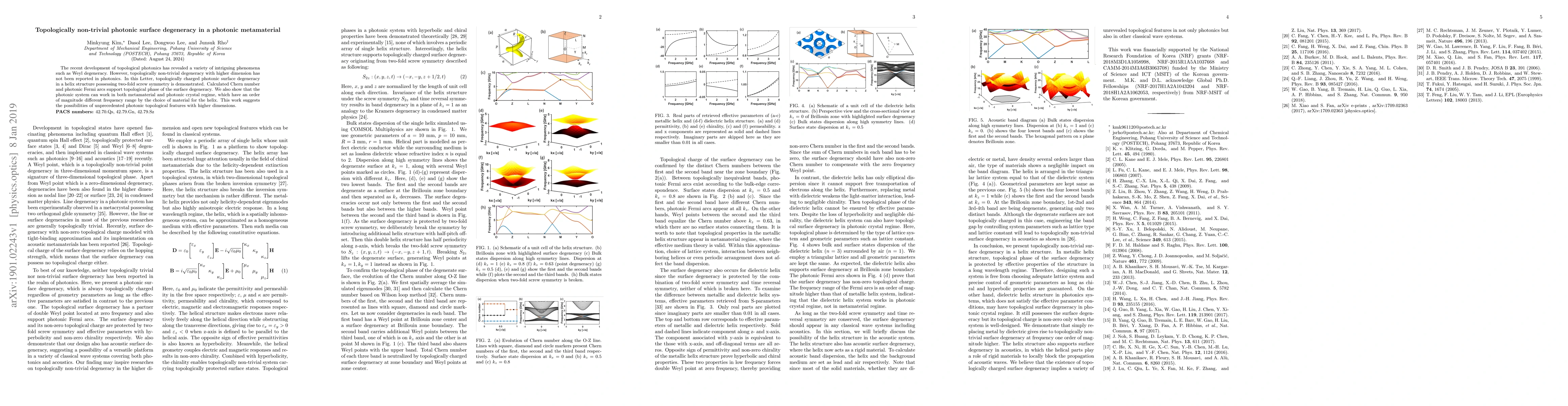 This paper demonstrates topologically non-trivial photonic surface degeneracy in a helical metamaterial with two-fold screw symmetry, supported by calculated Chern number and photonic Fermi arcs. The system can operate in both metamaterial and photonic crystal regimes across vastly different frequency ranges.