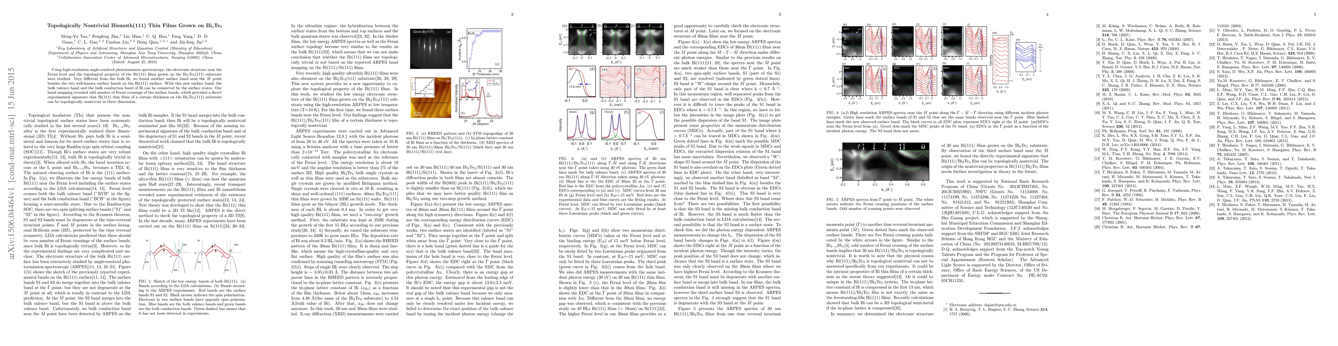Using high-resolution angle-resolved photoemission spectroscopy, the electronic structure near the Fermi level and the topological property of the Bi(111) films grown on the Bi$_2$Te$_3$(111) substrate were studied. Very different from the bulk Bi, we found another surface band near the $\bar{M}$ point besides the two well-known surface bands on the Bi(111) surface. With this new surface band, the bulk valence band and the bulk conduction band of Bi can be connected by the surface states. Our band mapping revealed odd number of Fermi crossings of the surface bands, which provided a direct experimental signature that Bi(111) thin films of a certain thickness on the Bi$_2$Te$_3$(111) substrate can be topologically nontrivial in three dimension.